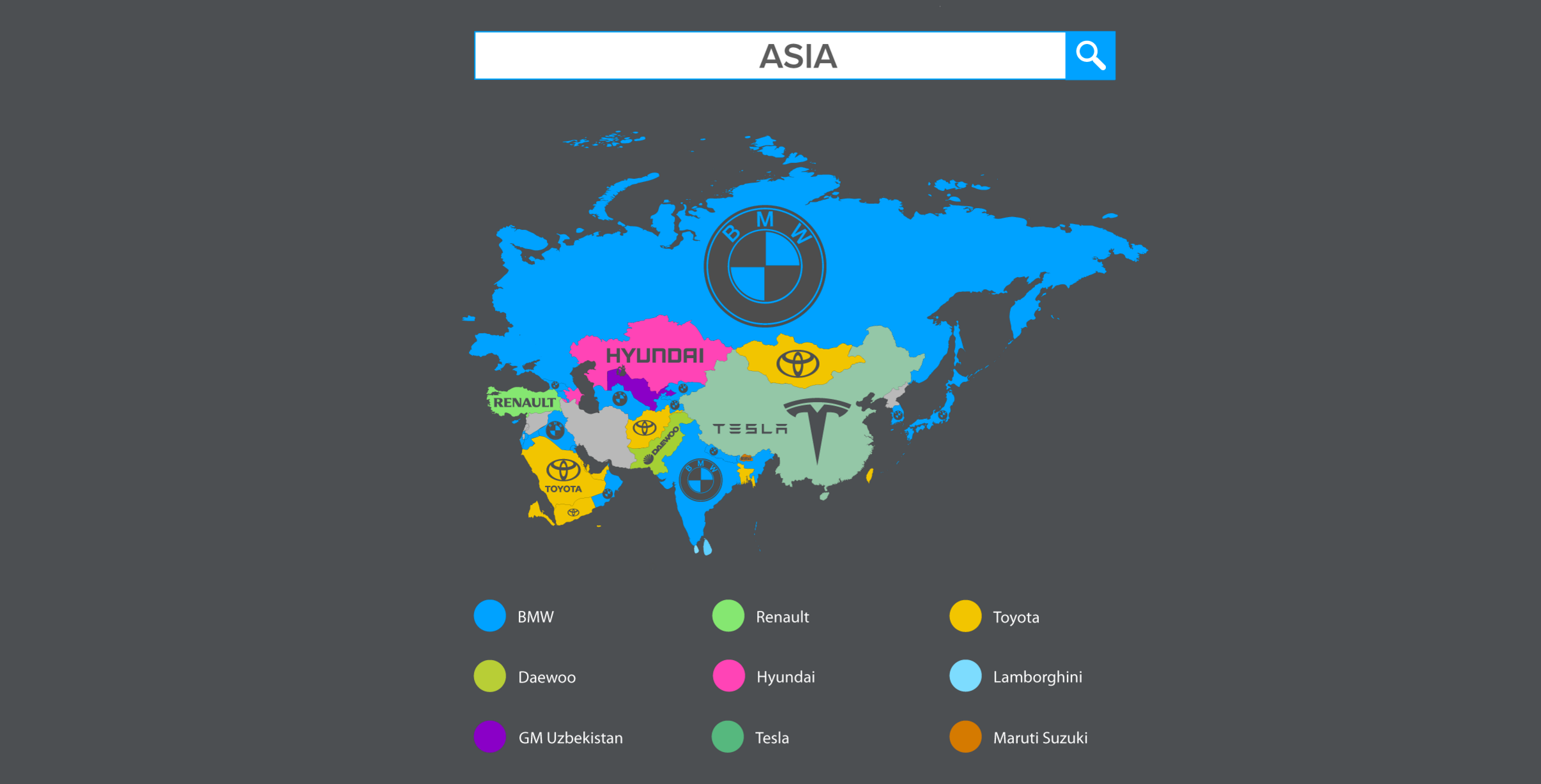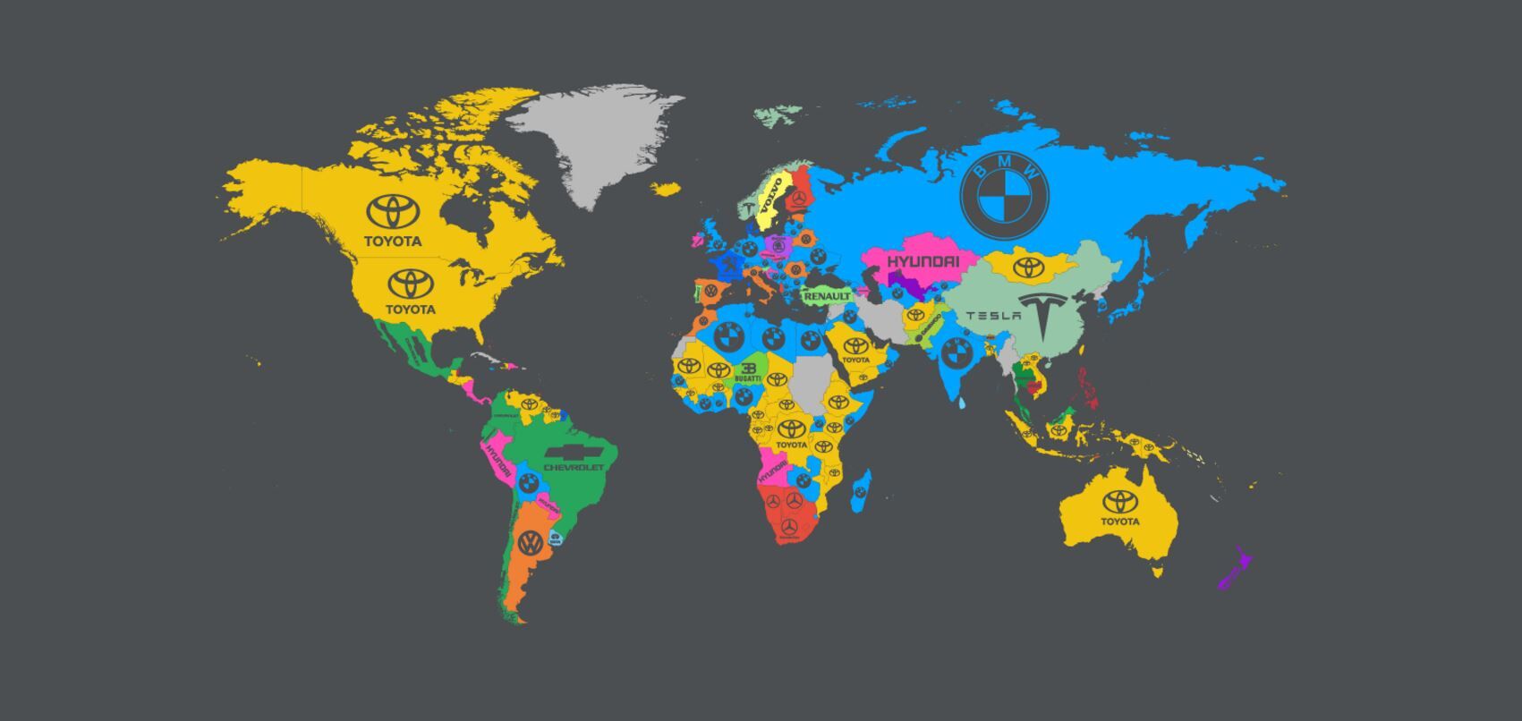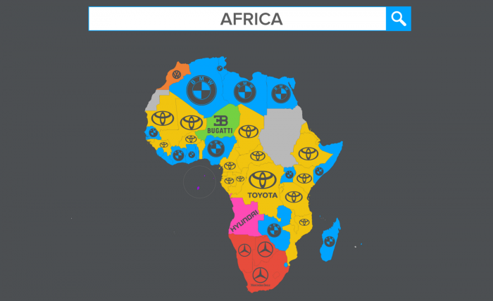Las marcas más anheladas en el globo terráqueo, BMW y Toyota, también lo son en el continente africano. El amarillo se instala en la mayor parte del territorio dejando paso a un potente azul celeste. Mercedes, por su parte, conquista los terrenos del sur mientras la marca francesa Bugatti se queda con Niger, Volkswagen con Marruecos y Hyundai con Angola.
