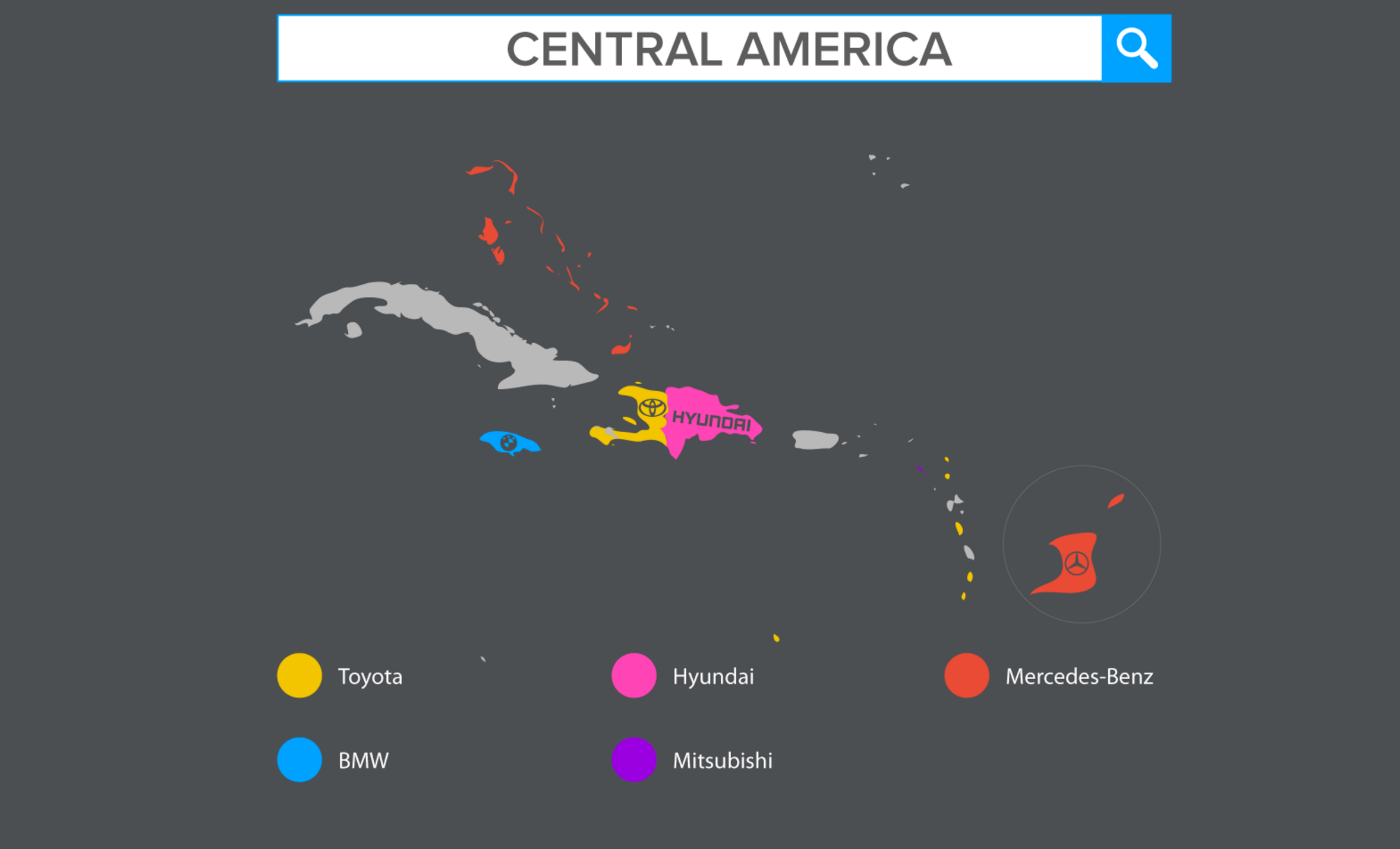En Centroamérica no hay un claro ganador ya que Toyota, BMW, Hyundai, Mitsubishi y Mercedes-Benz son los fabricantes más deseados en el mismo porcentaje de países.Y en cuanto a Latinoamérica, Chevrolet le hace frente al color amarillo (Toyota) y se posiciona como la marca fetiche en cuatro países: Brasil, Chile, Colombia y Ecuador.