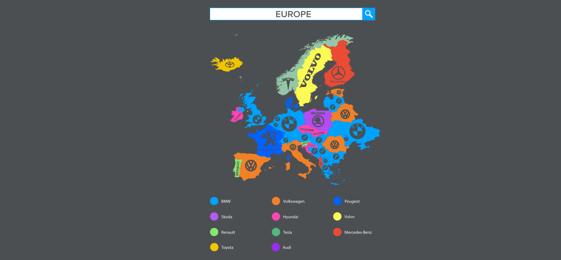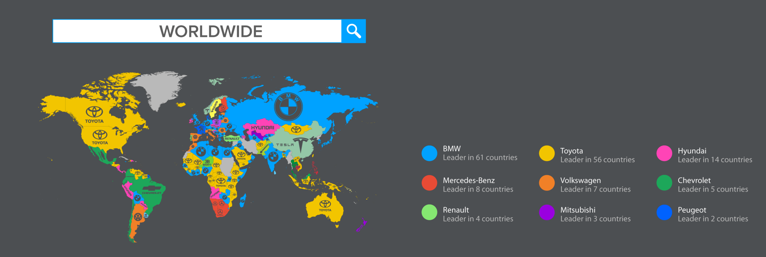 En el podio de las marcas más buscadas en el viejo continente está el fabricante alemán BMW cuyo logo llega a aparecer en el mapa hasta 16 veces. En segundo puesto, a pesar de la polémica que ha causado con sus motores trucados el año pasado, Volkswagen es la marca preferida en cinco países, entre los que se encuentra España. Aparecen en las demás zonas del amplio territorio europeo Skoda, Renault, Toyota, Hyundai, Tesla, Audi, Peugeot, Volvo y Mercedes-Benz.