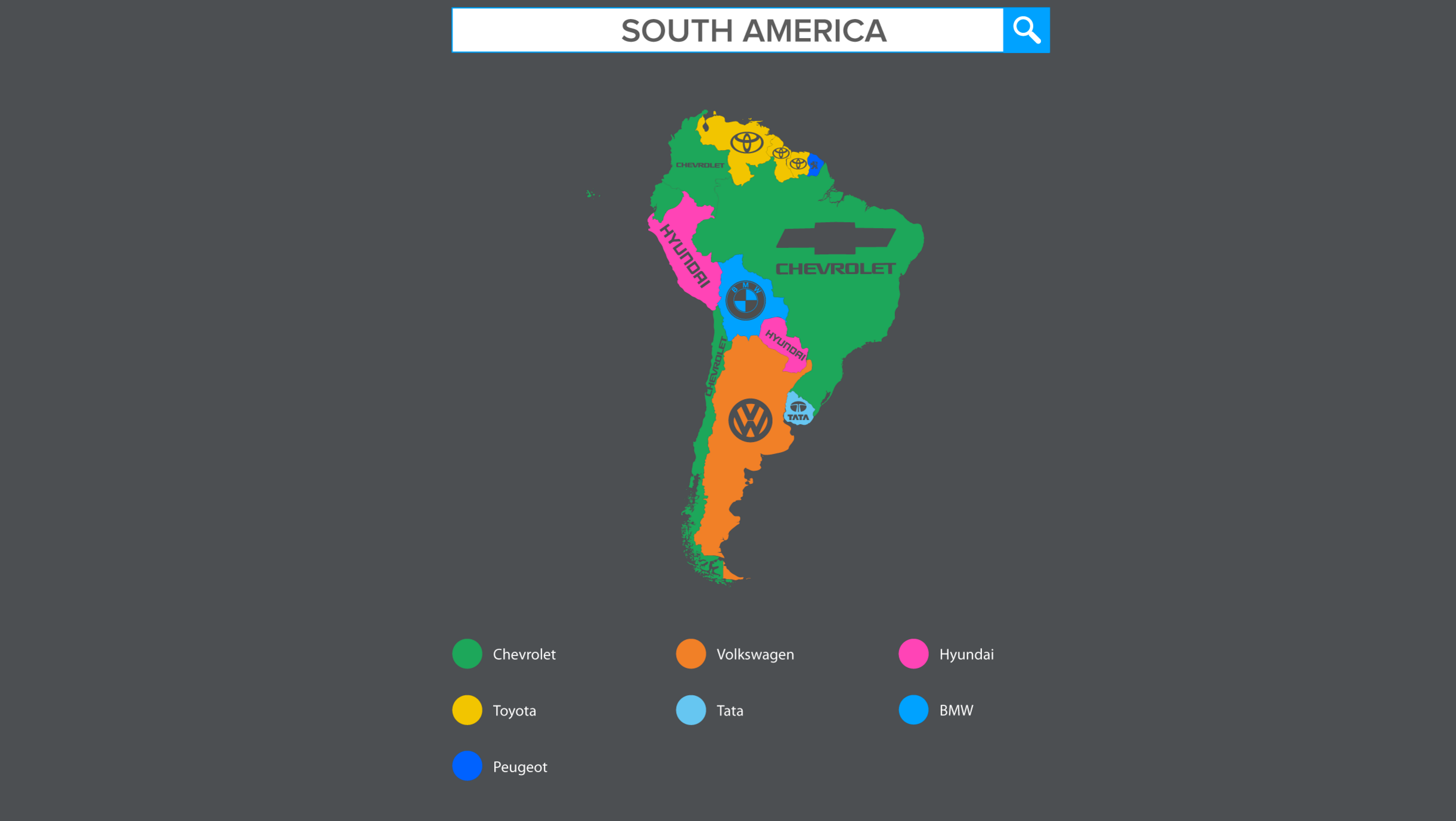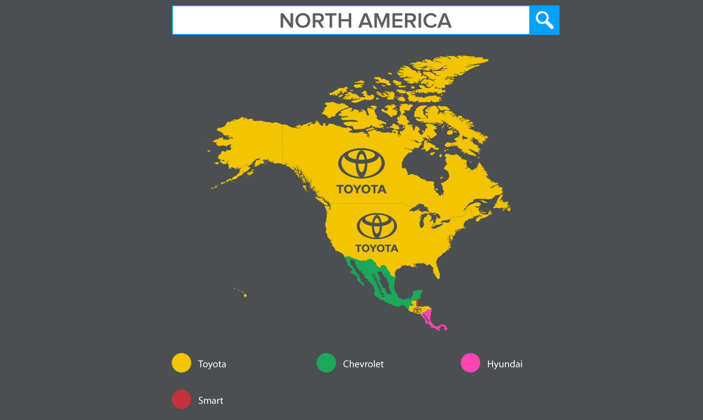 El color amarillo, que representa a Toyota, destaca en Norteamérica ya que está presente en los países más extensos: Canadá y Estados Unidos. Asimismo, el fabricante japonés recibe una cantidad significativa de búsquedas en México, donde las marcas Chevrolet, Hyundai y Smart se reparten las entradas en las demás zonas del país.