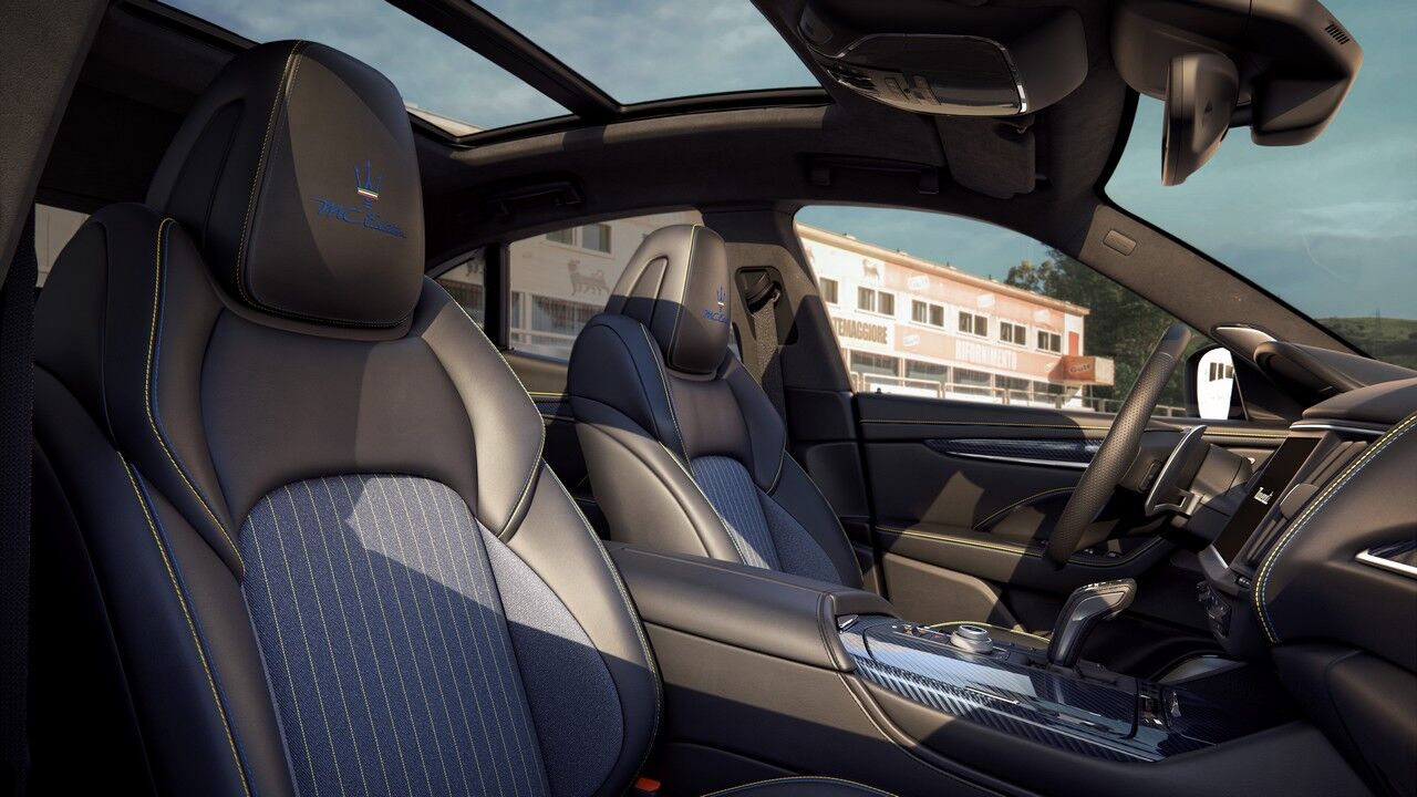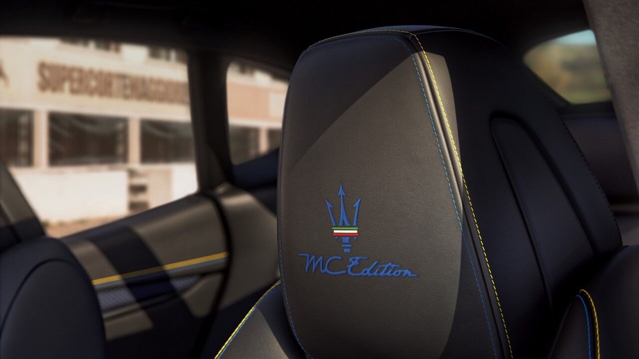 El alma racing de esta edición especial también la encontramos en dos colores exclusivos como son el Giallo Corse y el Blu Vittoria, gracias a los cuales la referencia a las raíces de la marca ya se hace evidente desde el exterior. El amarillo y el azul son también los colores de Módena, la ciudad símbolo del Motor Valley y hogar de Maserati. Para completar el exterior, la gama MC Edition viene con algunos y oscuros detalles distintivos en Black Piano y una insignia específica en las aletas delanteras y el pilar B.