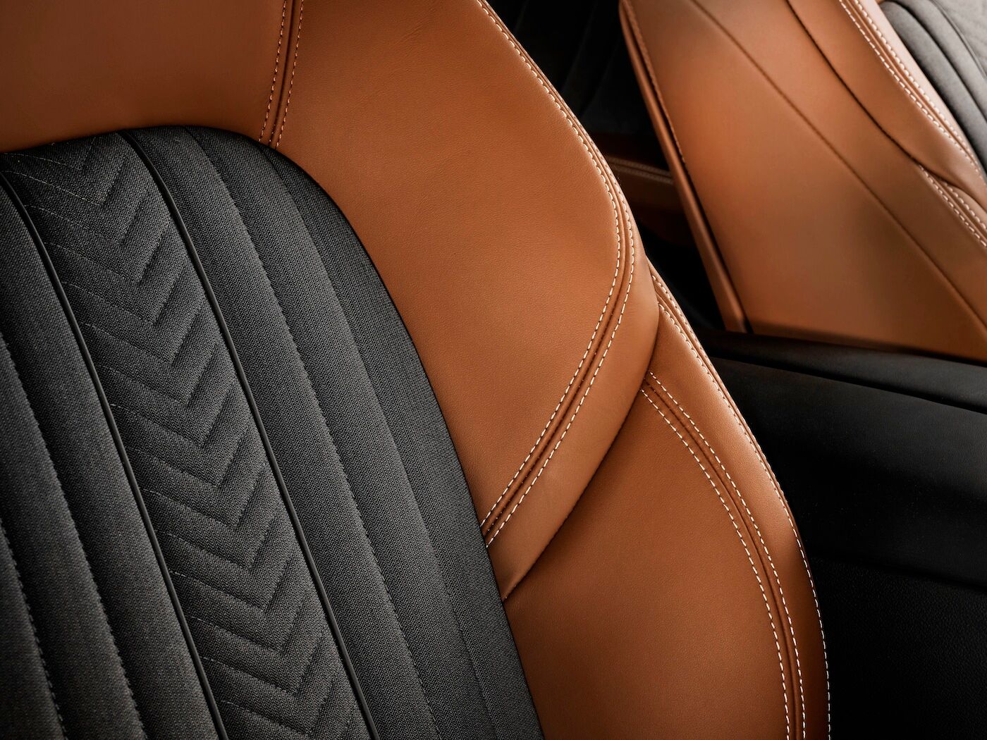 La posición de conducción combina el lujo y deportividad al mismo tiempo. Los materiales utilizados son el cuero Poltrona Frau y seda Ermenegildo Zegna micro-chevron con dos tonos de colores (cuero y gris claro) y costuras de color blanco, que proporcionan esa sensación de lujo. Destacan los bordados del logo de la marca en los cabeceros de las cuatro plazas. Por otra parte, los detalles en carbono le dan ese toque racing, que no desentona con la filosofía de la marca.