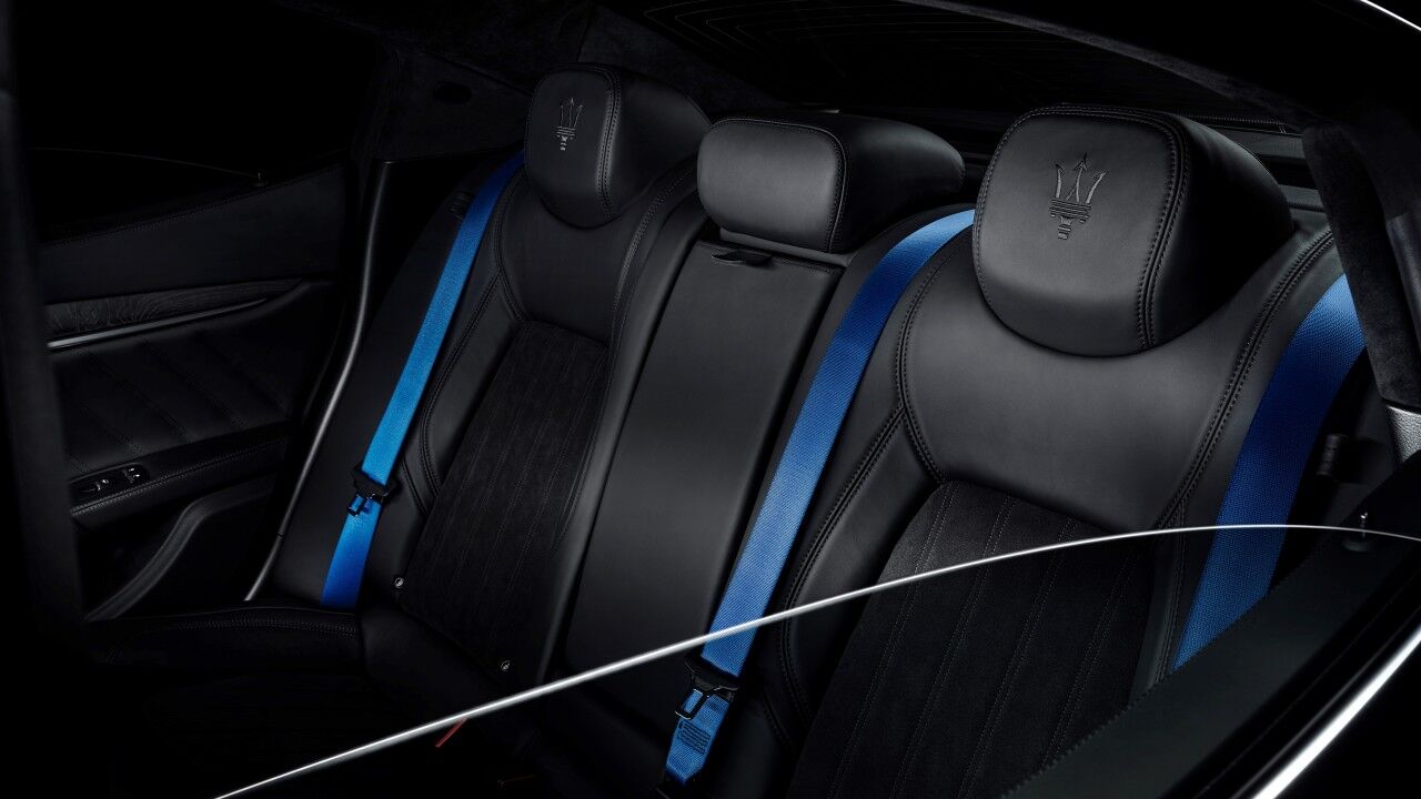 En el interior, el cuero de primera calidad y el Alcántara son los materiales dominantes, y los asientos lucen inserciones plateadas en contraste tanto en las costuras verticales como para el logotipo de Maserati en los reposacabezas. Otro elemento que ayuda a resaltar sobre el negro son los cinturones de seguridad, que presentan un acabado en el característico azul oscuro de la marca. Ciertamente, a pesar de contar con algunos tantos años a sus espaldas (el modelo original data de 2013), las actualizaciones de 2020 lo mantienen competente.