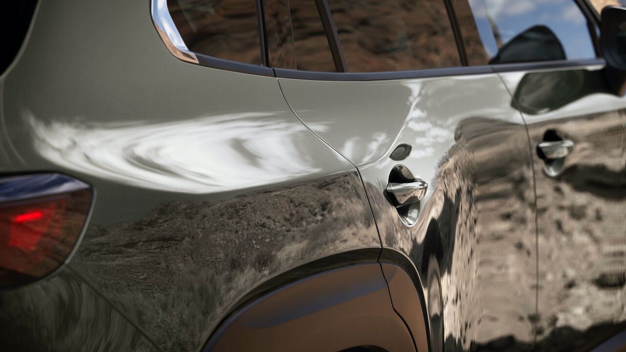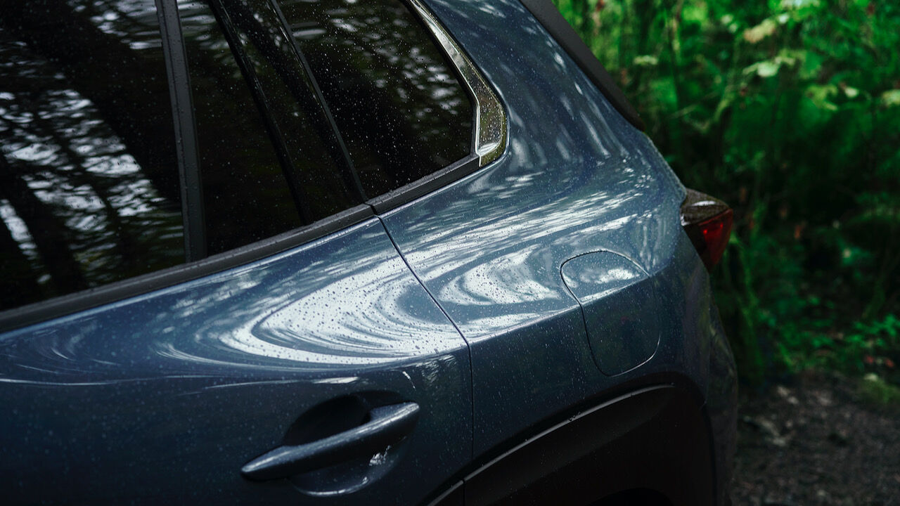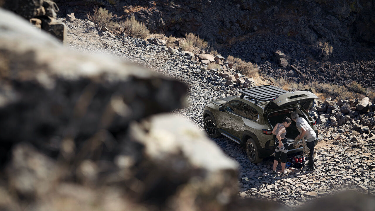 Ya desde fuera se puede apreciar que el Mazda CX-50 es diferente. Mantiene el lenguaje de diseño Kodo de la marca, aunque con una evolución para ganar ese carácter todoterreno que mencionamos. Es más robusto gracias a las barras de techo de alta resistencia, que junto a unos pilares B reforzados permiten cargar lo que se quiera sobre esta superficie. No faltan unos pasos de rueda muy marcados o los plásticos recubriendo toda la parte inferior de la carrocería. Las llantas también son específicas de este modelo.