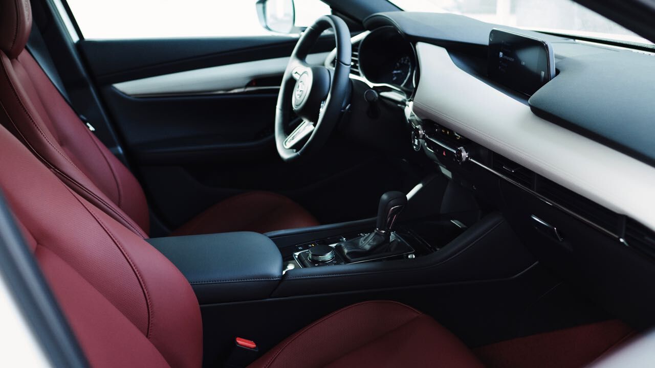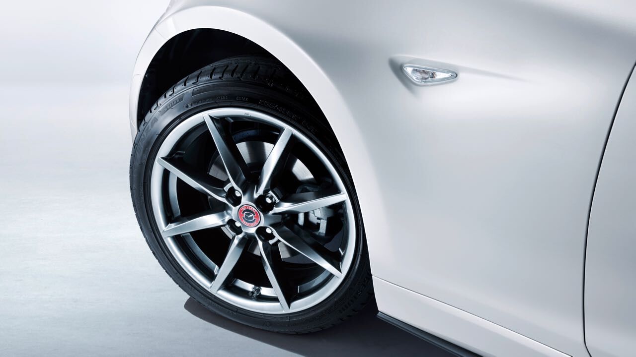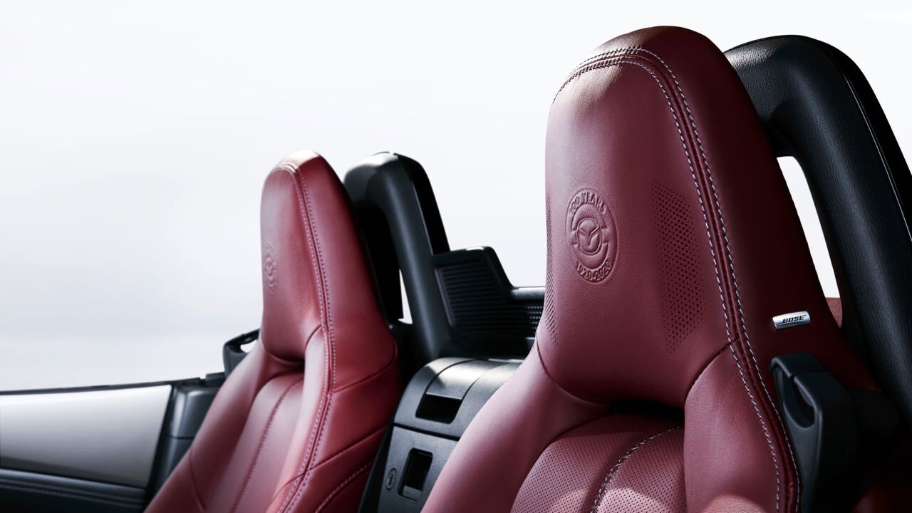 El Mazda MX-5 100 Aniversario tiene una carrocería en blanco perlado, que combina a la perfección con la capota y la tapicería en piel, ambos en color burdeos o los arcos antivuelco en negro brillante. Las llantas de 16 pulgadas tienen el emblema 100 Aniversario grabado, un detalle que encontramos también en las aletas delanteras. La funda de la llave es también especial, así como las alfombrillas.