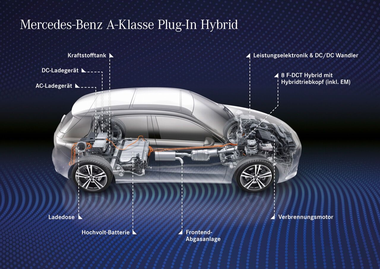 El Mercedes A 250 e también monta otros dos elementos destacados. El primero es la transmisión automática de doble embrague 8F-DCT, que ha sido adaptada para el modelo híbrido enchufable. El segundo es una batería de iones de litio de 15,3 kWh, que es la que permite al Clase A tener una autonomía eléctrica de hasta 68 kilómetros (según ciclo WLTP). La batería se puede cargarse en un Wallbox de 7,4 kW en una hora y tres cuartos con corriente alterna o en unos 25 minutos en corriente continua (al 80 %).