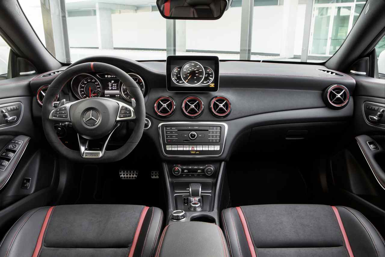 Asimismo se ha revalorizado el interior, extremadamente deportivo. El tablero de instrumentos, al igual que la línea de cintura en las puertas, está forrado de serie con símil de cuero Artico, con costuras de contraste rojas y acabados en negro mate. Entre las novedades figura también el paquete opcional AMG Dinamica para el puesto de conducción, que añade molduras específicas, un volante Performance...
