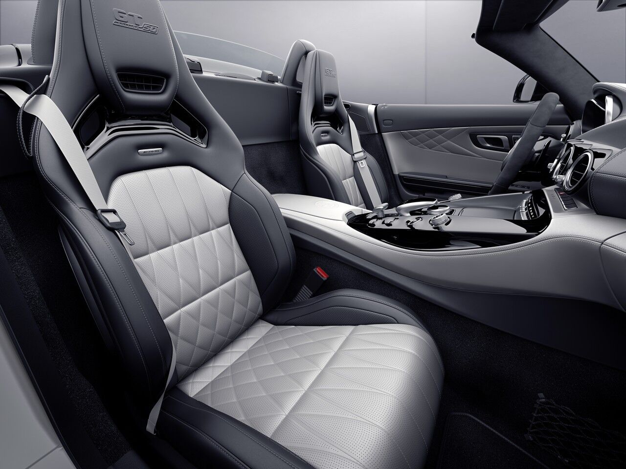 El interior del AMG GT C Roadster Edition 50 destacará por los contrastes entre negro y plateado. La tapicería de cuero nappa va en estos colores y recubre los asientos, el volante y otros elementos. Para acentuar su deportividad lleva el paquete AMG Interior Night. El motor será el mismo V8 biturbo de 4.0 litros con 557 CV y 680 Nm. Con la transmisión automática de siete velocidades acelera de 0 a 100 km/h en 3,7 segundos.
