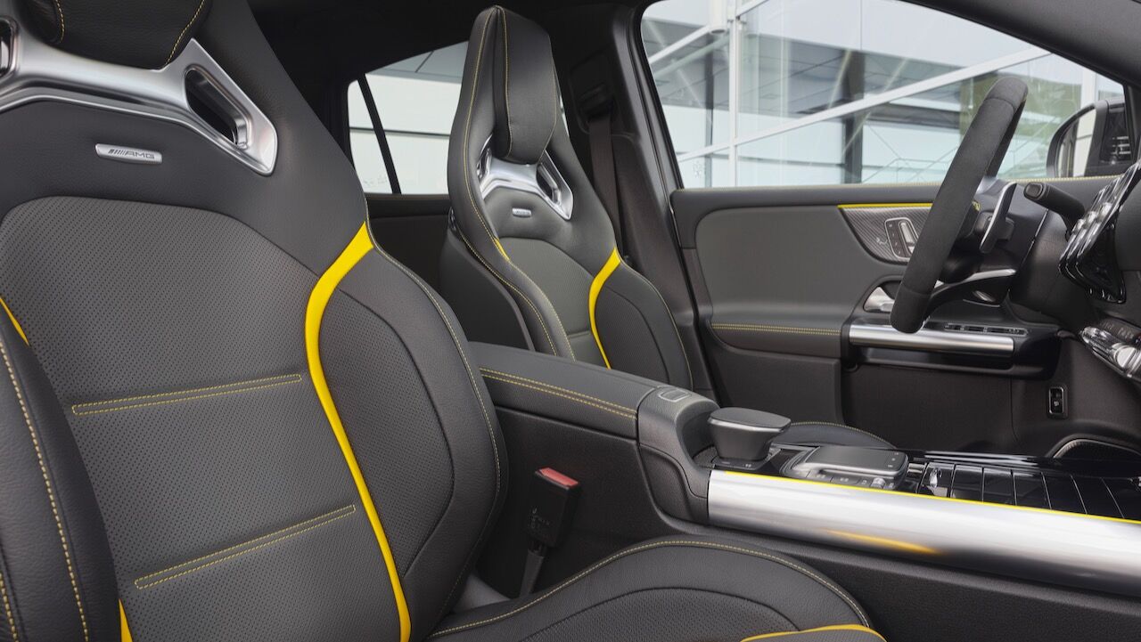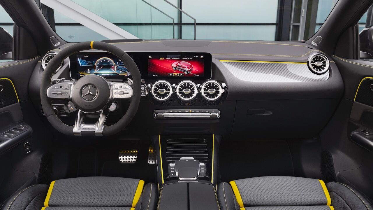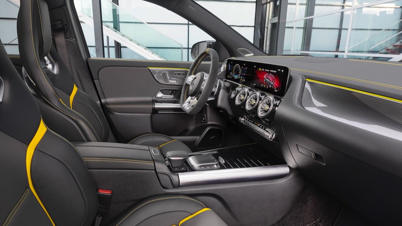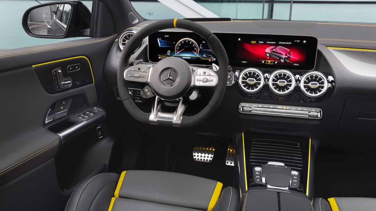En el interior no se queda atrás y el Mercedes-AMG GLA 45 4Matic+ y se pueden incorporar los asientos deportivos AMG Performance con tapicerías tan llamativas como la mixta que viene de serie o la de cuero de dos colores con costuras en contrastes opcional. No pasa desapercibido el volante AMG Performance con el mando para cambiar de modo. En este ejemplar la tecnología se mantiene y, además, se puede montar el sistema AMG Track Pace para acceder a una completa telemetría.