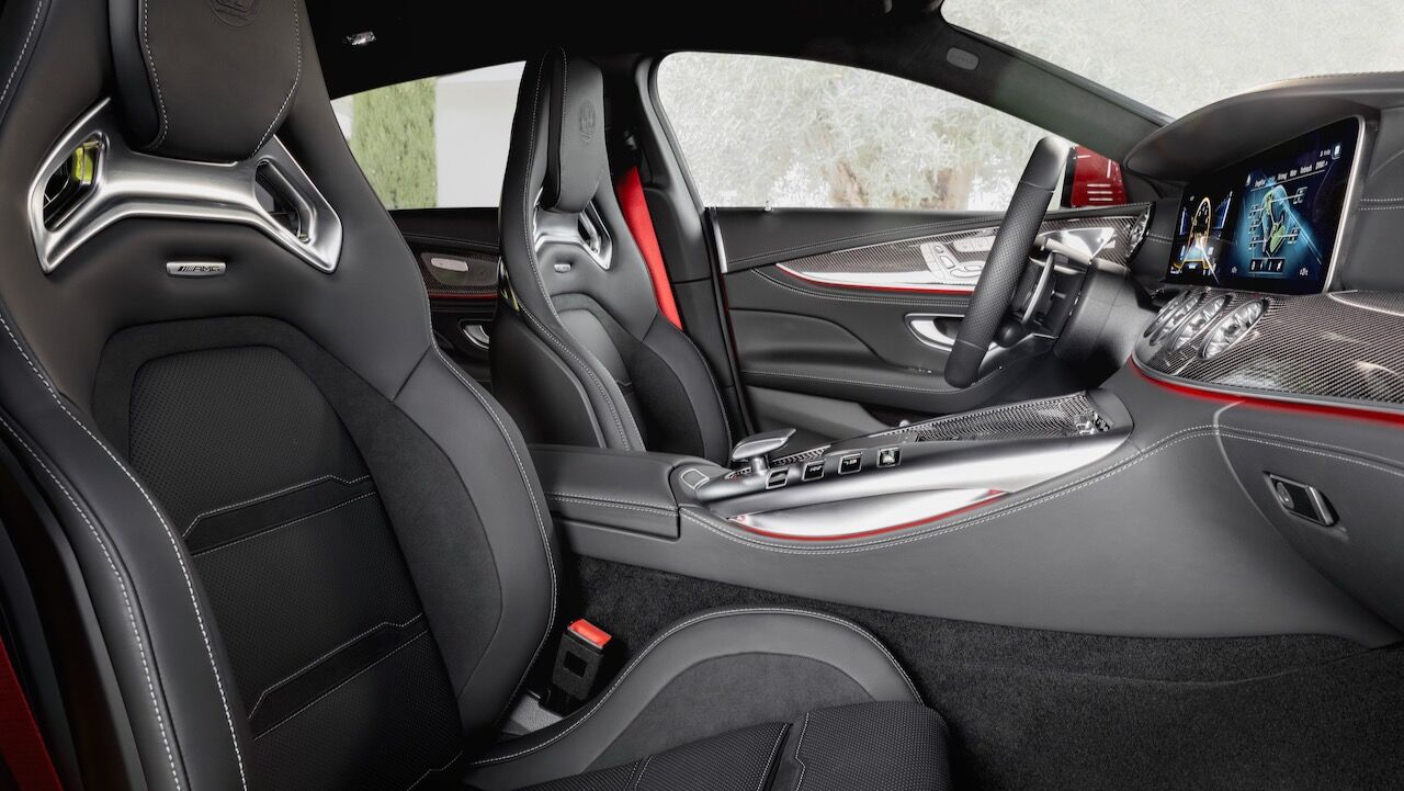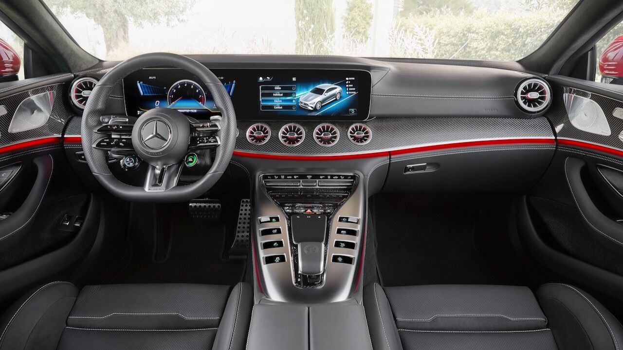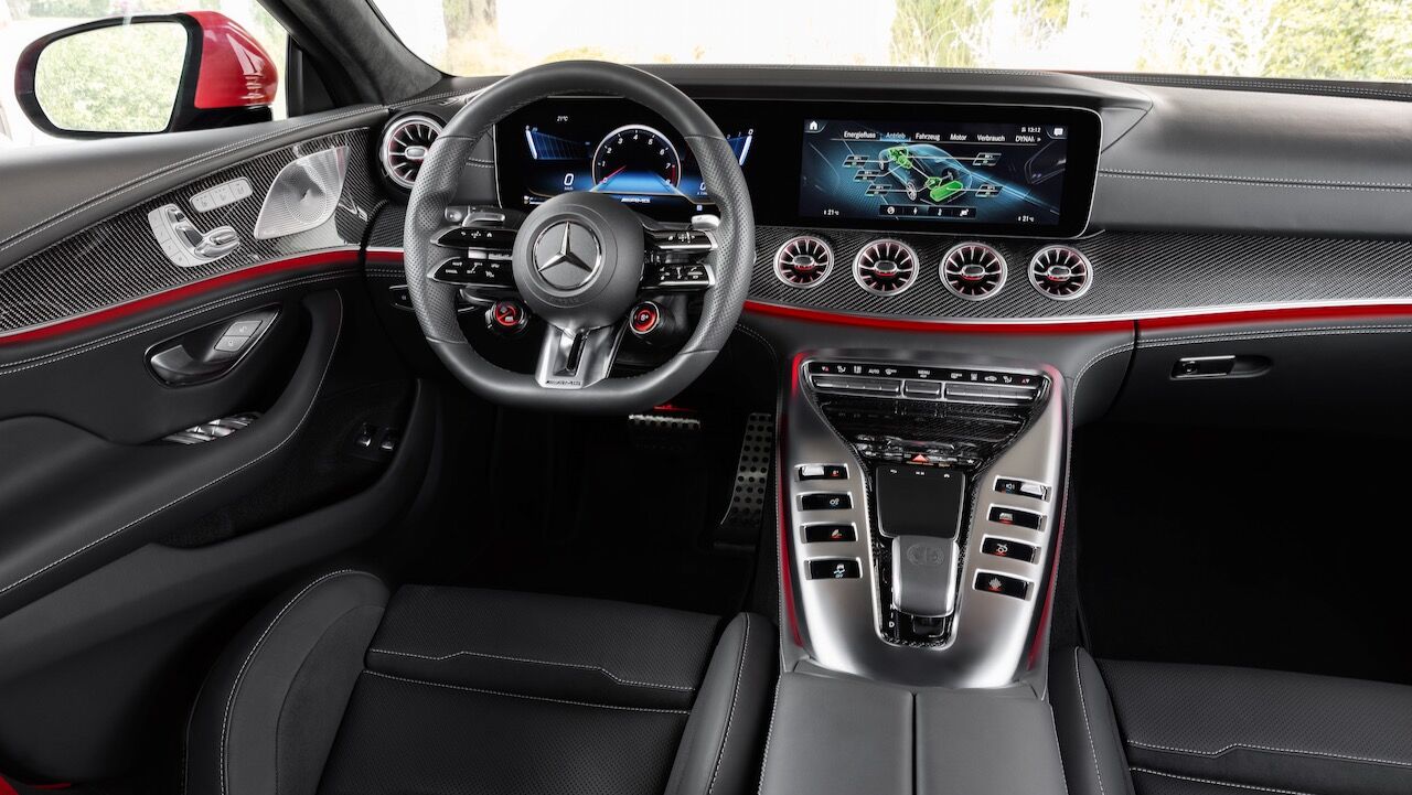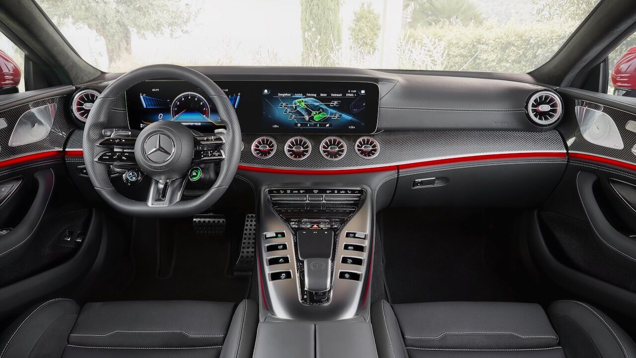El interior del Mercedes-AMG GT 63 S E Performance se mantiene con el mismo nivel de calidad y tecnología. Los puntos específicos de esta versión deportiva son el volante AMG Performance con diseño de radios dobles con los mandos circulares para los modos de conducción y también unos nuevos menús específicos para mostrar informaciones como la autonomía eléctrica, el consumo eléctrico, la potencia y el par del motor eléctrico o la temperatura de la batería.