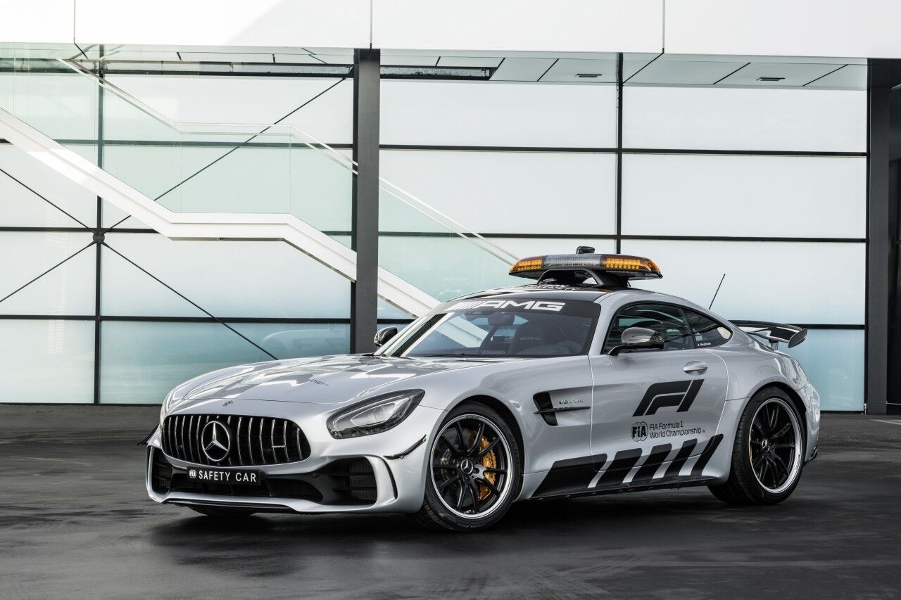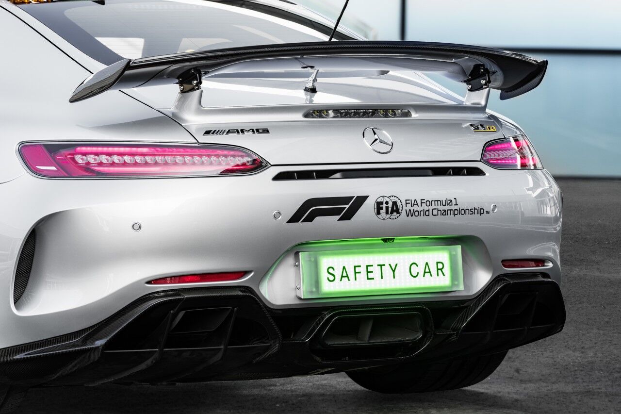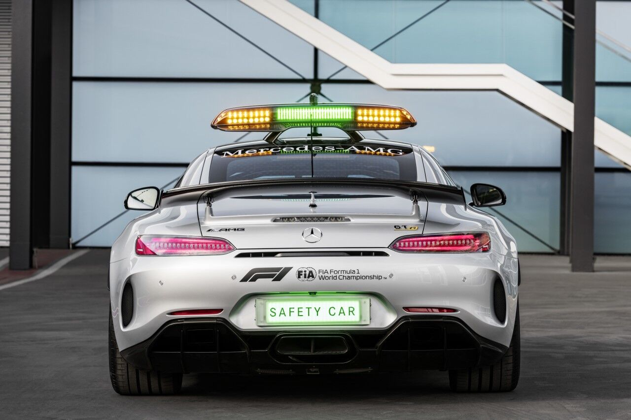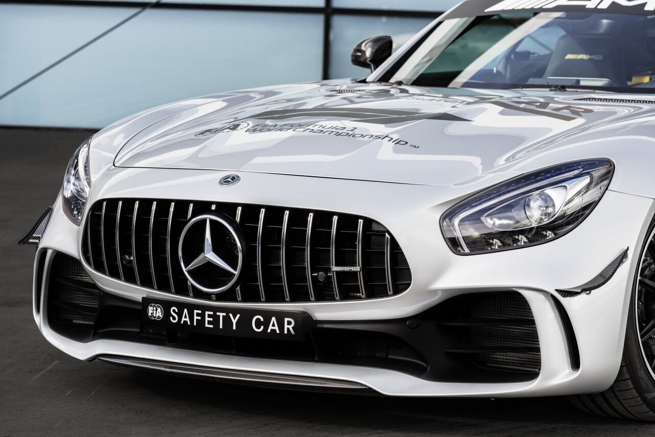Para llegar a ser el Safety Car de la Fórmula 1, el Mercedes-AMG GT R ha tenido que adaptarse. Por ello monta el paquete AMG Track, que incluye los frenos cerámicos opcionales y una jaula de seguridad. Por fuera se aprecian las diferencias gracias a los vinilos y al puente de luces de fibra de carbono que ofrece una menor resistencia al aire. El encargado de pilotar este ejemplar seguirá siendo el piloto Bernd Mayländer junto al copiloto Richard Darker, que se beneficiarán de un avanzado sistema de comunicaciones.
