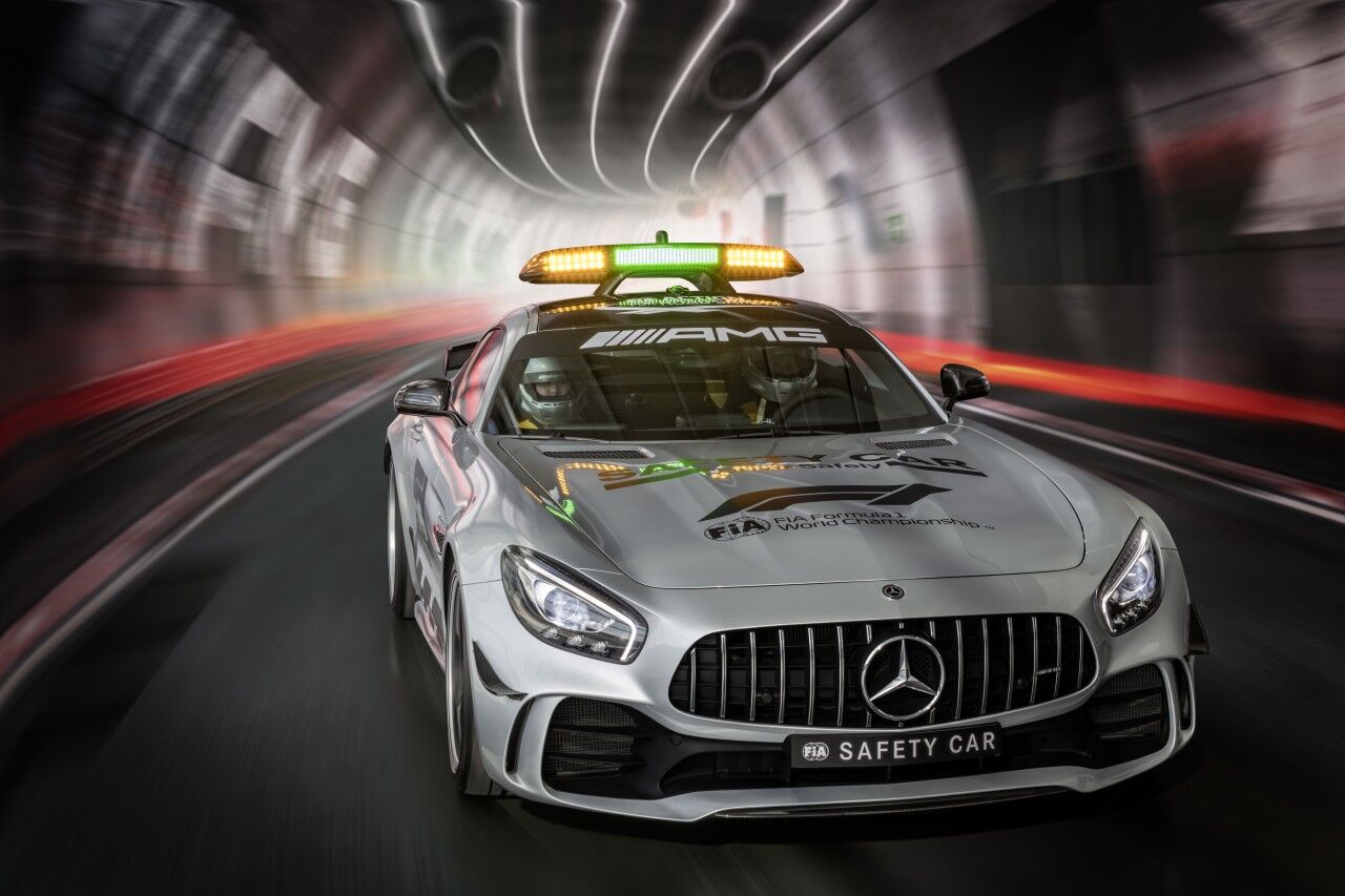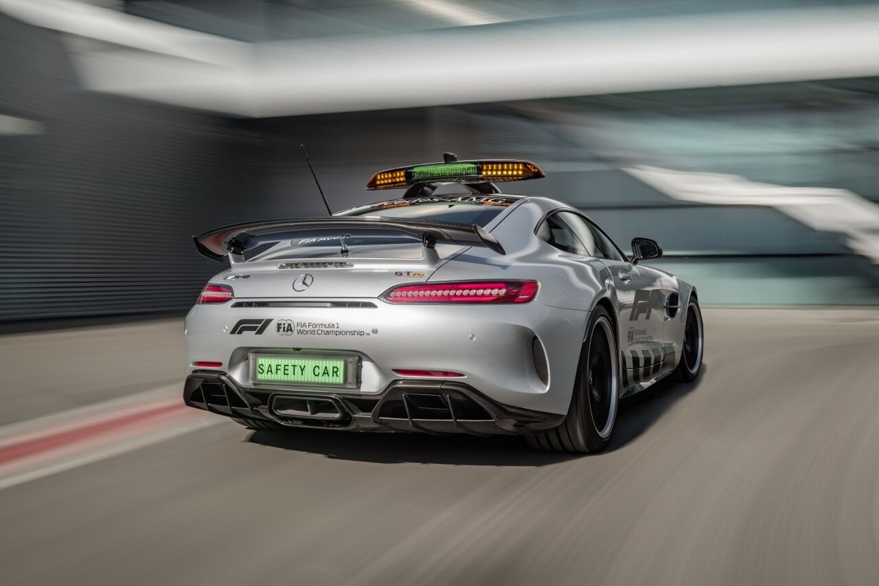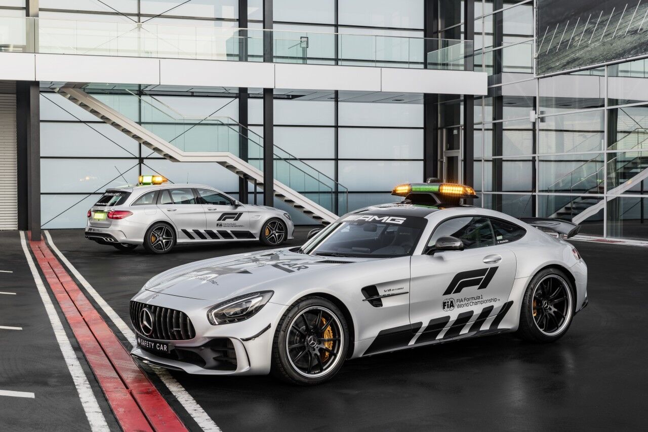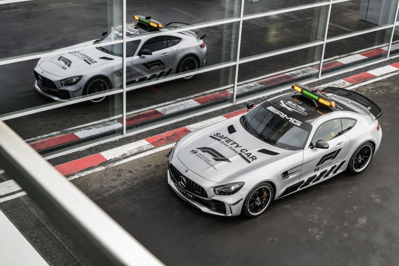 Para llegar a ser el Safety Car de la Fórmula 1, el Mercedes-AMG GT R ha tenido que adaptarse. Por ello monta el paquete AMG Track, que incluye los frenos cerámicos opcionales y una jaula de seguridad. Por fuera se aprecian las diferencias gracias a los vinilos y al puente de luces de fibra de carbono que ofrece una menor resistencia al aire. El encargado de pilotar este ejemplar seguirá siendo el piloto Bernd Mayländer junto al copiloto Richard Darker, que se beneficiarán de un avanzado sistema de comunicaciones.