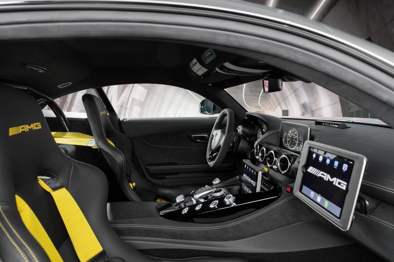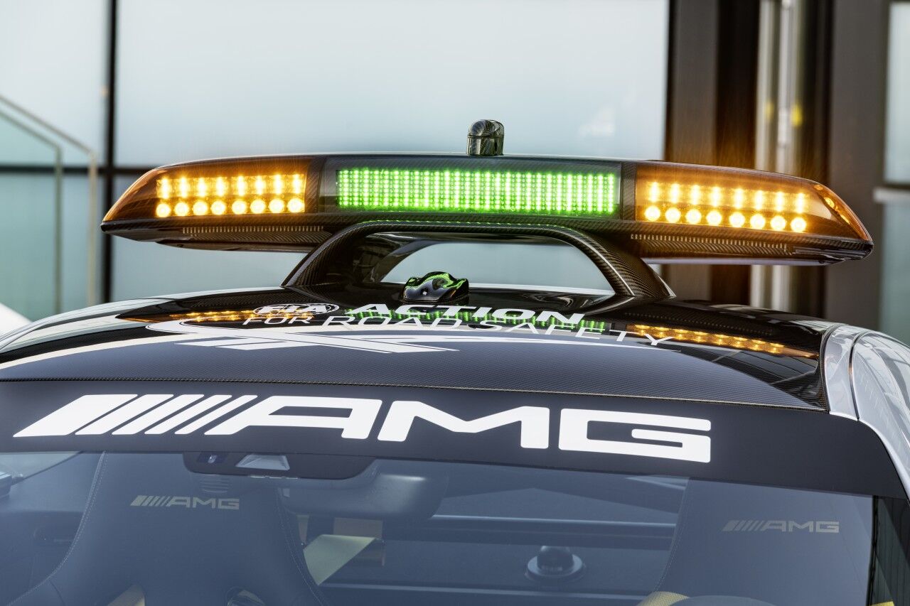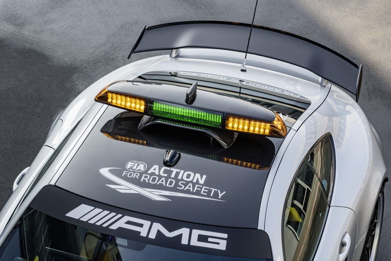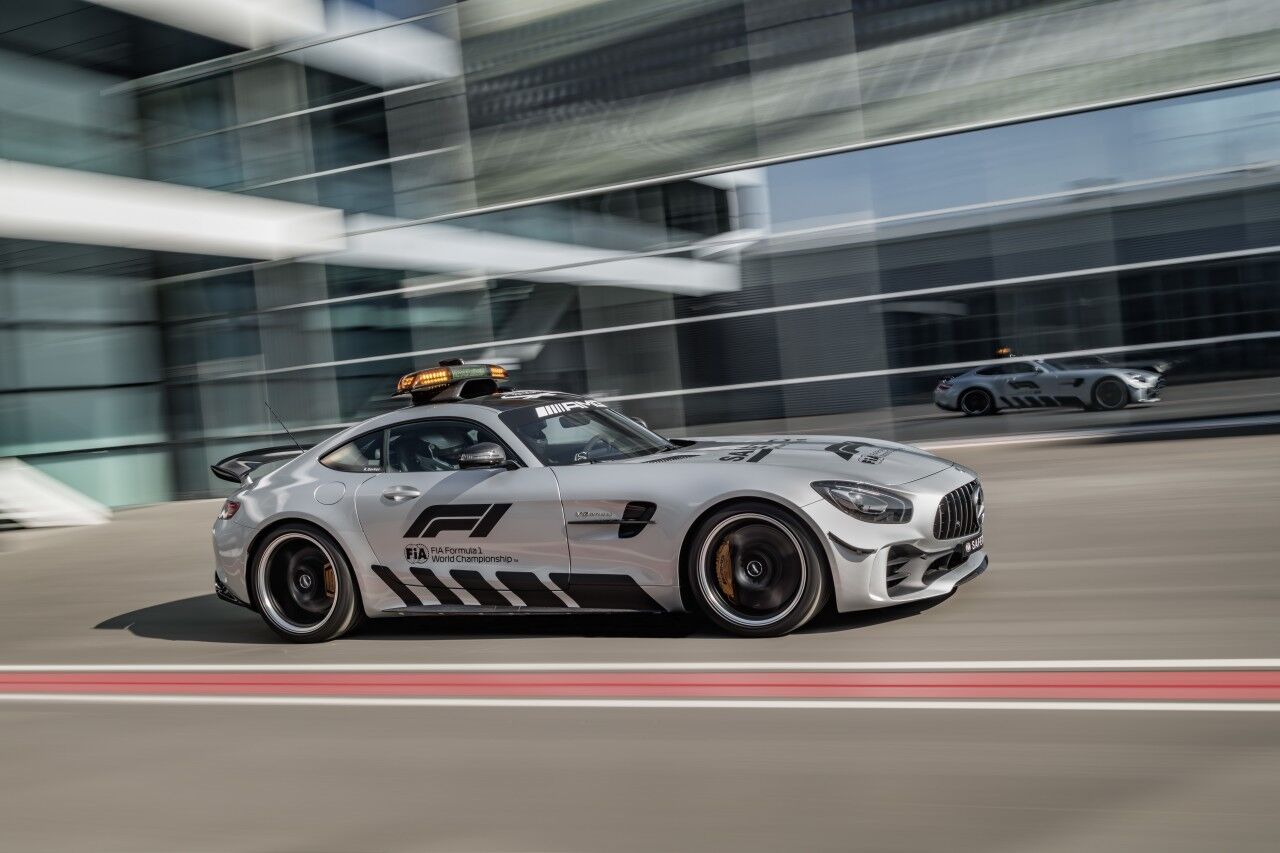 Para llegar a ser el Safety Car de la Fórmula 1, el Mercedes-AMG GT R ha tenido que adaptarse. Por ello monta el paquete AMG Track, que incluye los frenos cerámicos opcionales y una jaula de seguridad. Por fuera se aprecian las diferencias gracias a los vinilos y al puente de luces de fibra de carbono que ofrece una menor resistencia al aire. El encargado de pilotar este ejemplar seguirá siendo el piloto Bernd Mayländer junto al copiloto Richard Darker, que se beneficiarán de un avanzado sistema de comunicaciones.