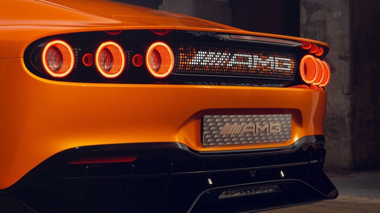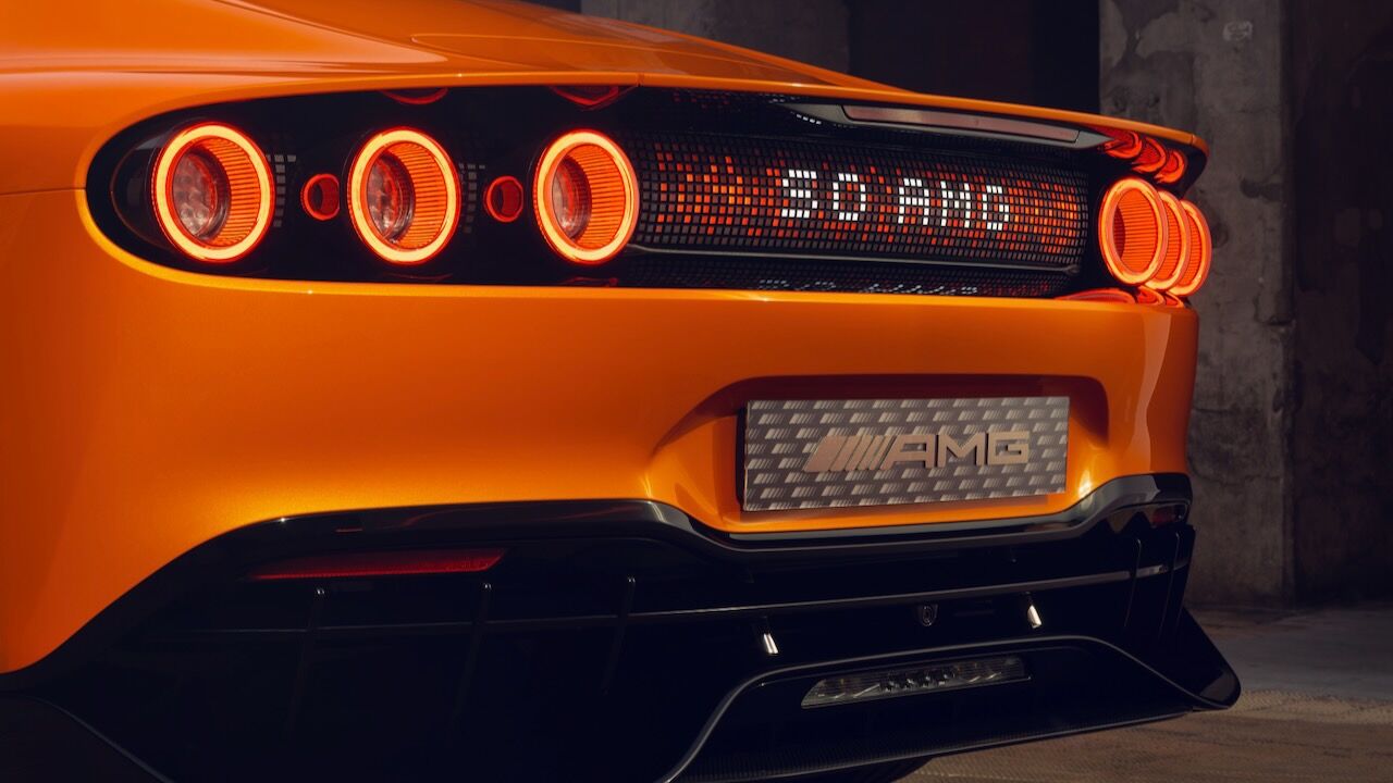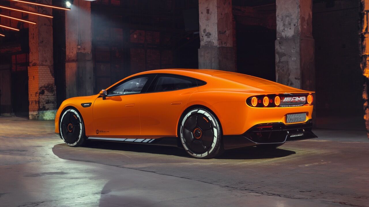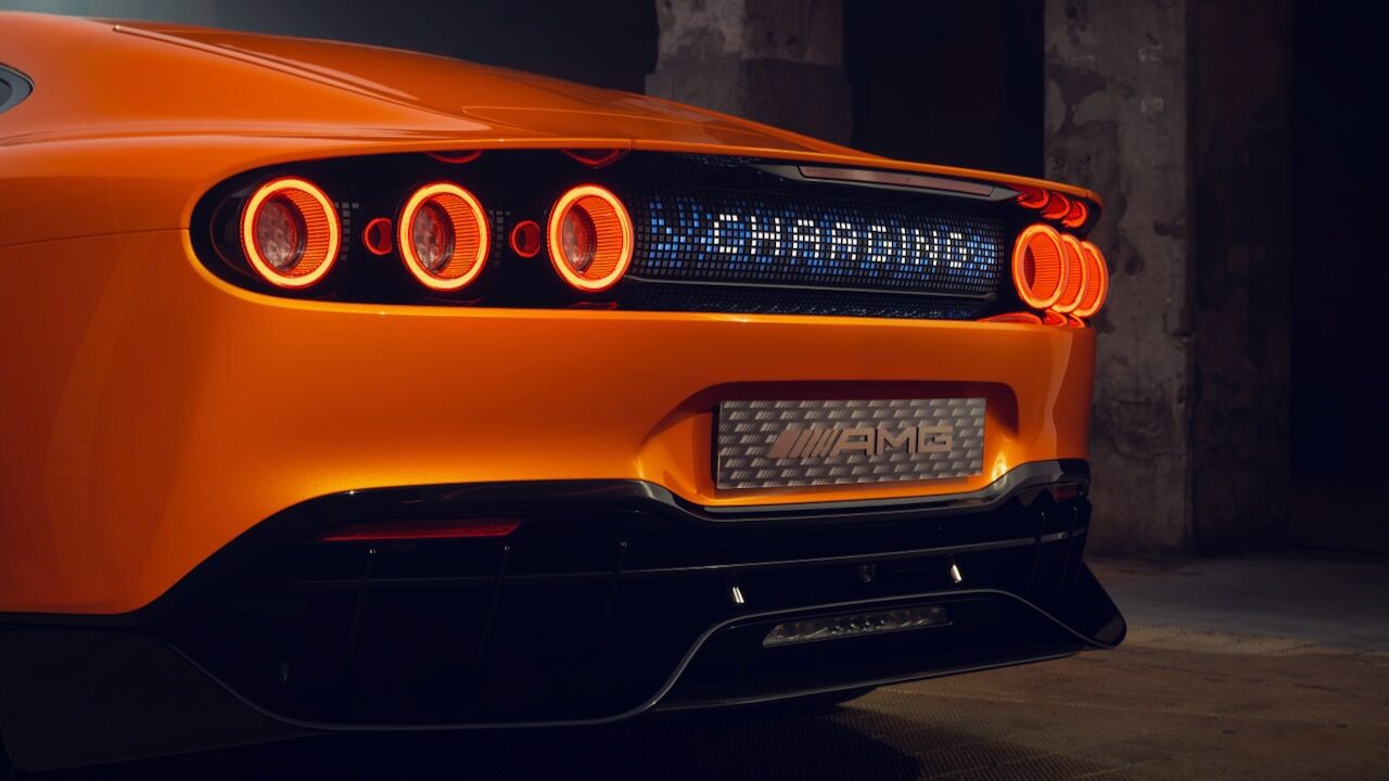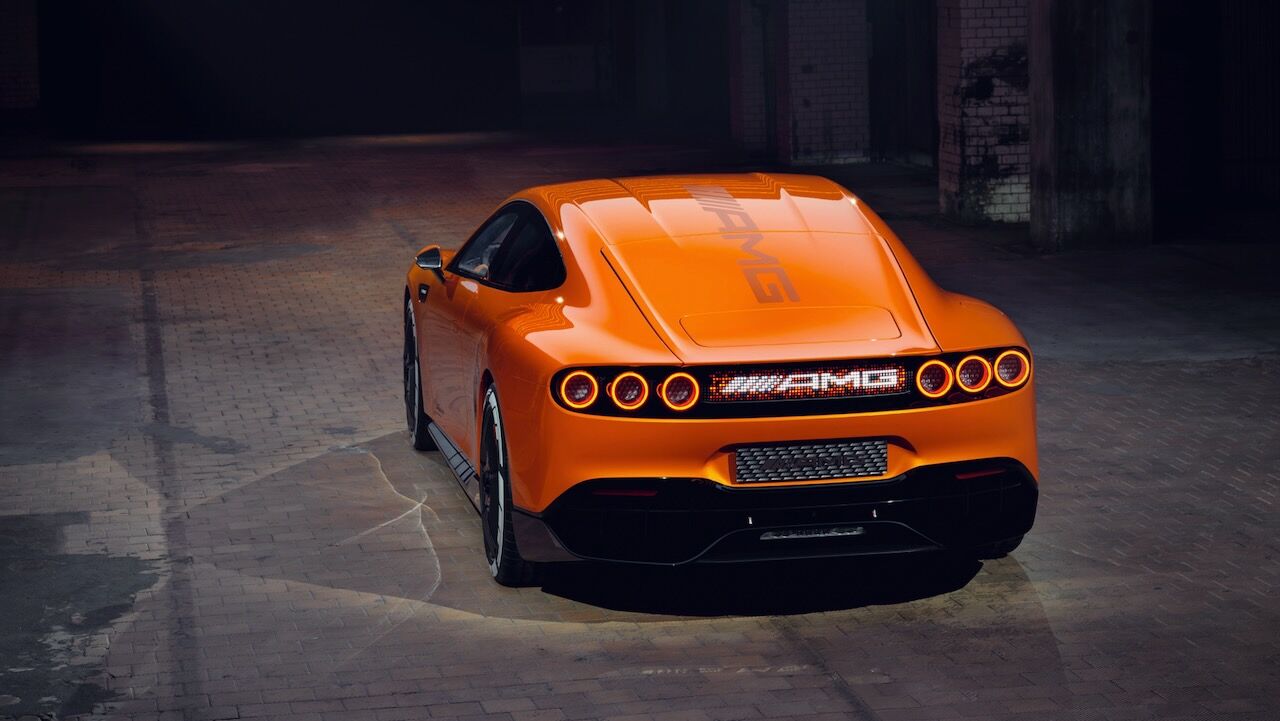 La silueta, con parabrisas inclinado y techo estilo coupé, enfatiza su carácter deportivo, mientras que las llantas de 21 pulgadas incorporan secciones móviles para optimizar refrigeración y aerodinámica. En la zaga, destaca un difusor de fibra de carbono, un alerón activo y un sistema de seis pilotos LED circulares. Todo rematado por el panel MBUX Fluid Light, que emplea más de 700 LED programables para comunicarse con el exterior mediante texto o animaciones.