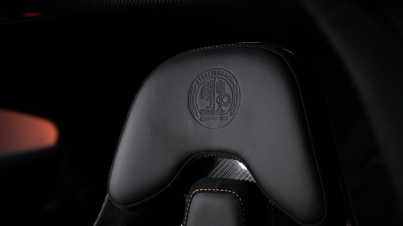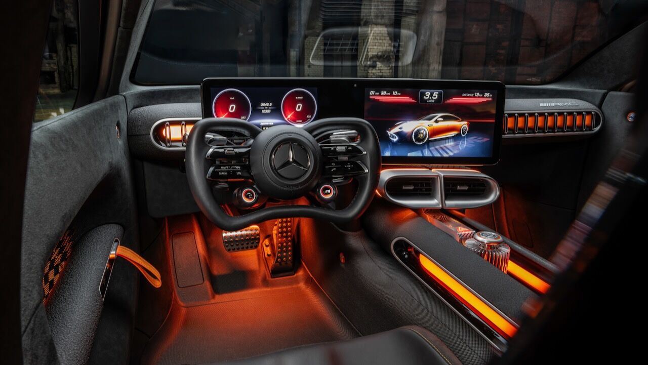 El habitáculo rompe con todo lo anterior visto en Mercedes. Inspirado en un simulador de carreras, incorpora un cuadro digital de 10,25 pulgadas, un sistema multimedia de 14 pulgadas y un volante compacto heredado del AMG One. Las butacas son de fibra de carbono, el salpicadero minimalista, y el suelo está fabricado con materiales reciclados. Los tubos naranjas iluminados en la consola recuerdan a los cables de alta tensión y refuerzan el carácter eléctrico.
