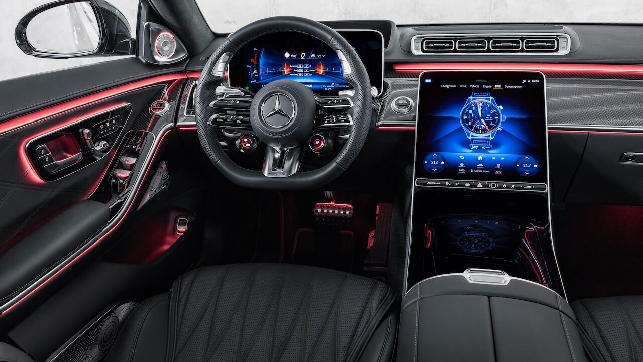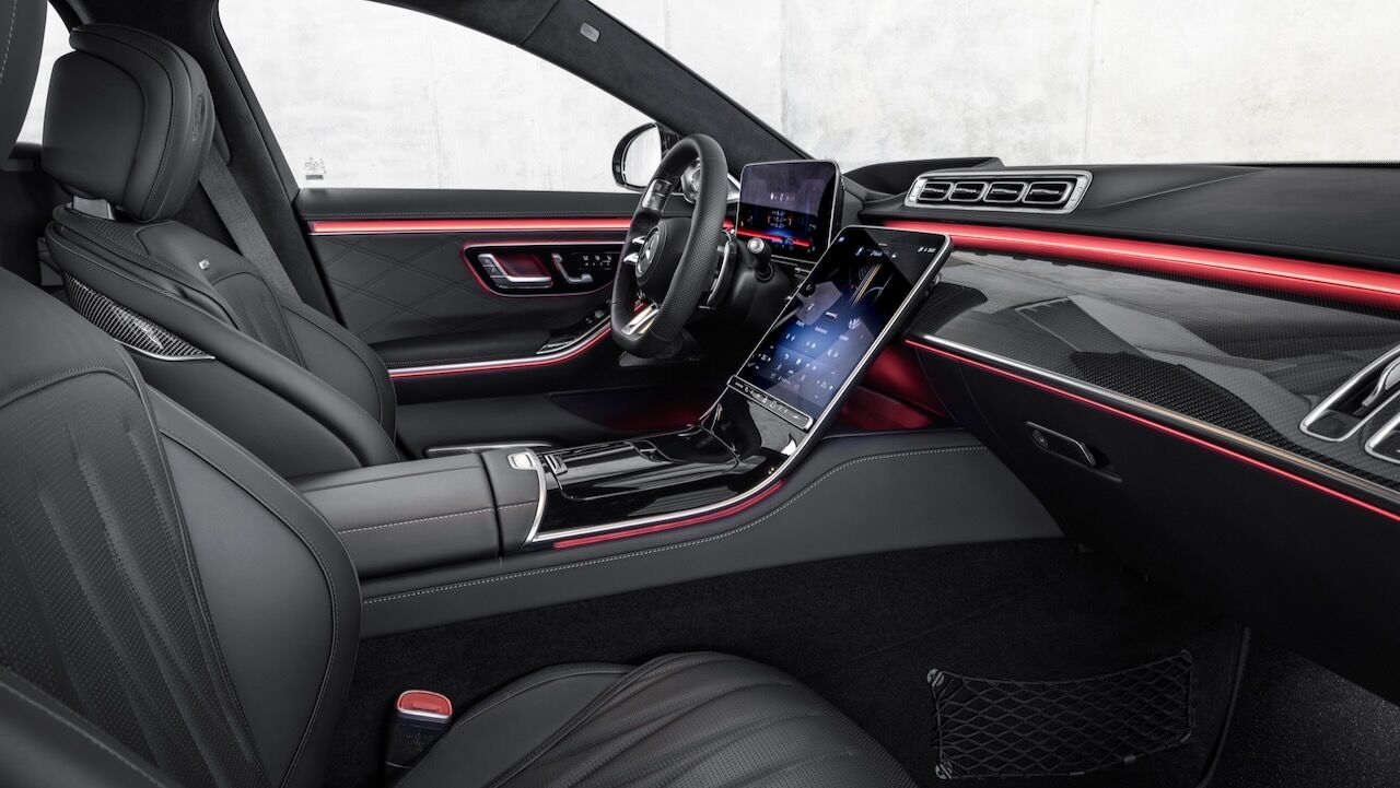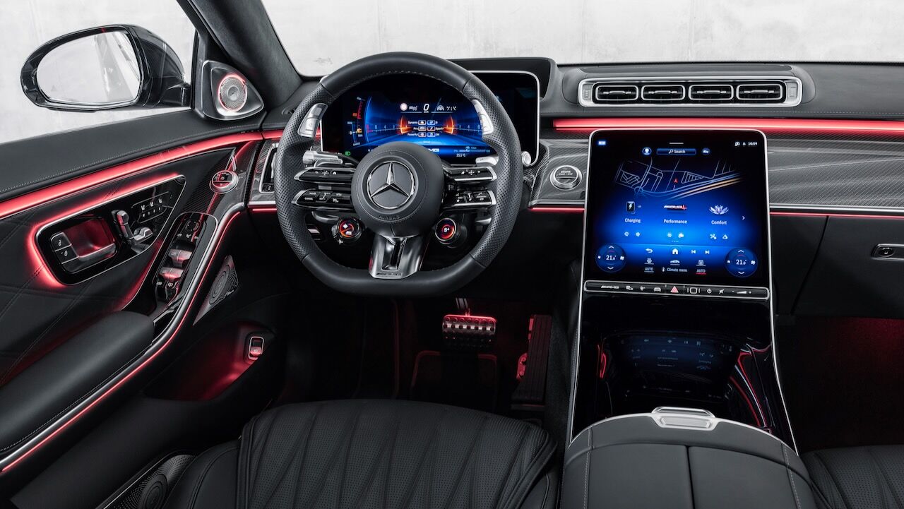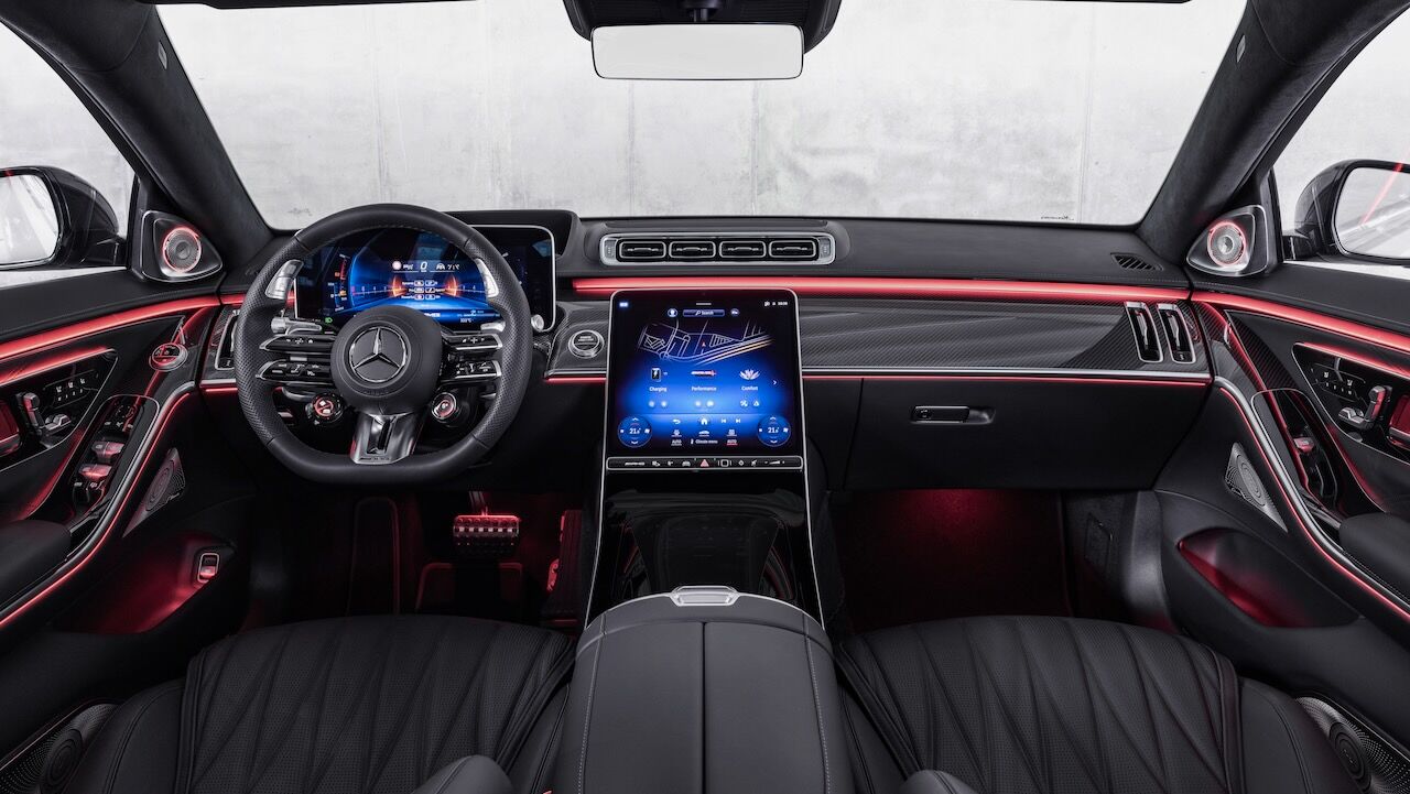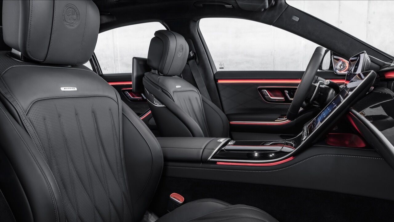 El habitáculo del Clase S más deportivo no se queda atrás, pues monta asientos con gráficos especiales AMG tapizados en cuero napa, además de molduras específicas y el volante AMG Performance. En el sistema multimedia MBUX se pueden encontrar menús y funciones exclusivas para este ejemplar, con detalles como el estilo de visualización Supersport.