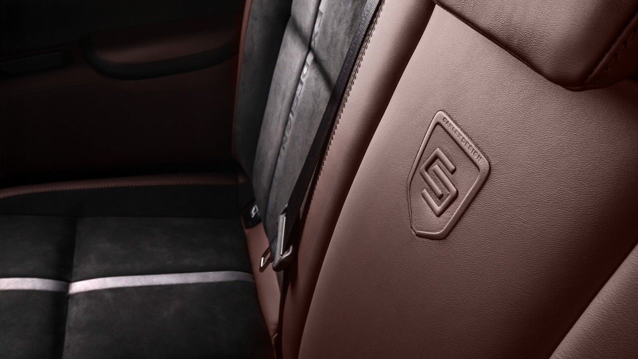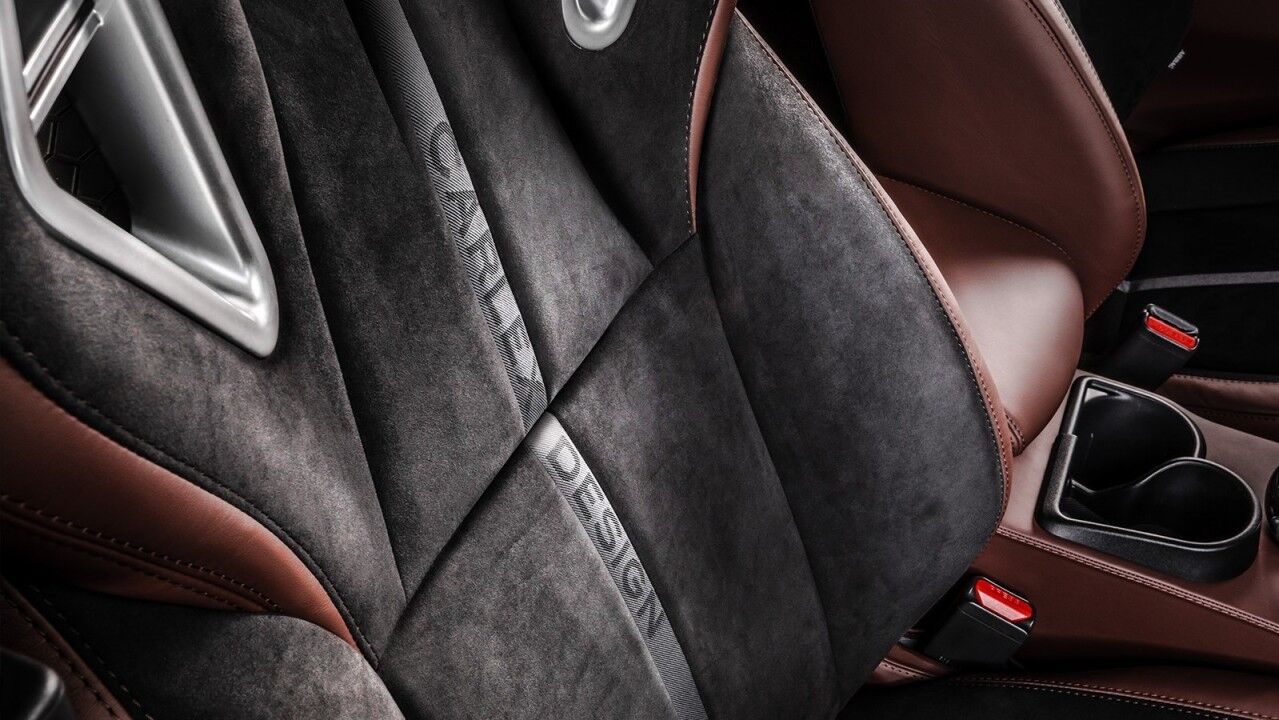 Elementos como el forraje de los asientos, la palanca de cambios, el freno de mano, la consola central y partes de los paneles de las puertas se han retapizado en cuero marrón, a juego con el exterior. Otras superficies, como las molduras de las puertas superiores, la parte superior del salpicadero y la zona de agarre del volante están revestidas en Alcántara. Completan los cambios interiores los asientos personalizados con secciones centrales negras, también de Alcántara, y alfombrillas de un tono marrón más oscuro.