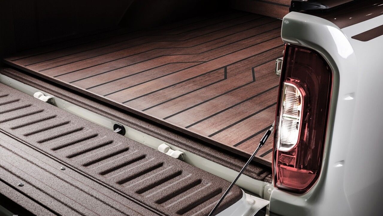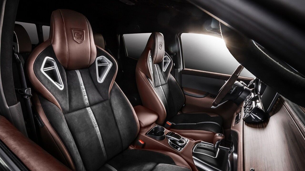 En la zaga, Carlex Design ha vestido la caja con madera de alta categoría. Aunque esta es más susceptible al daño que el revestimiento original de la plataforma de la camioneta, dudamos que el propietario cargue algo en la parte posterior. Para enfatizar el aspecto elegante a la par que el agresivo, el preparador centroeuropeo ha ensanchado a los pasos de rueda en las cuatro esquinas, donde se alojan las nuevas llantas de aleación pulidas muy similares a las de los coches Maybach, y parachoques de estilo AMG.