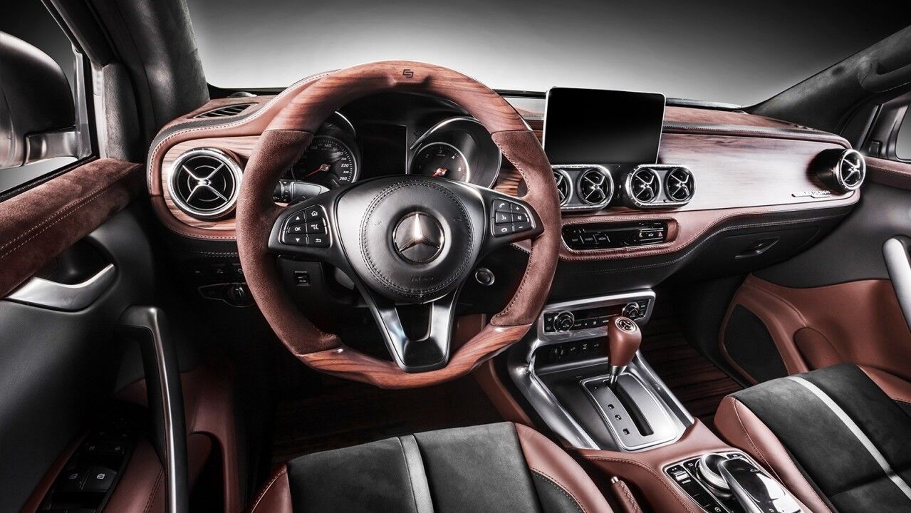 En el interior, esta Clase X se ve como ninguna otra. Para empezar, hay que destacar que las pick-ups no se caracterizan por ser extremadamente lujosas a bordo. Al igual que las furgonetas, una camioneta se diseña para no perecer con el paso de los años y el maltrato. Y aunque la Clase X está mejor terminada y detallada que la Nissan Navara en la que se pasa, Carlex Design ha desplegado su mejor quehacer y ha revestido el habitáculo con su mejor cuero y con acentos de madera en el salpicadero y el volante.