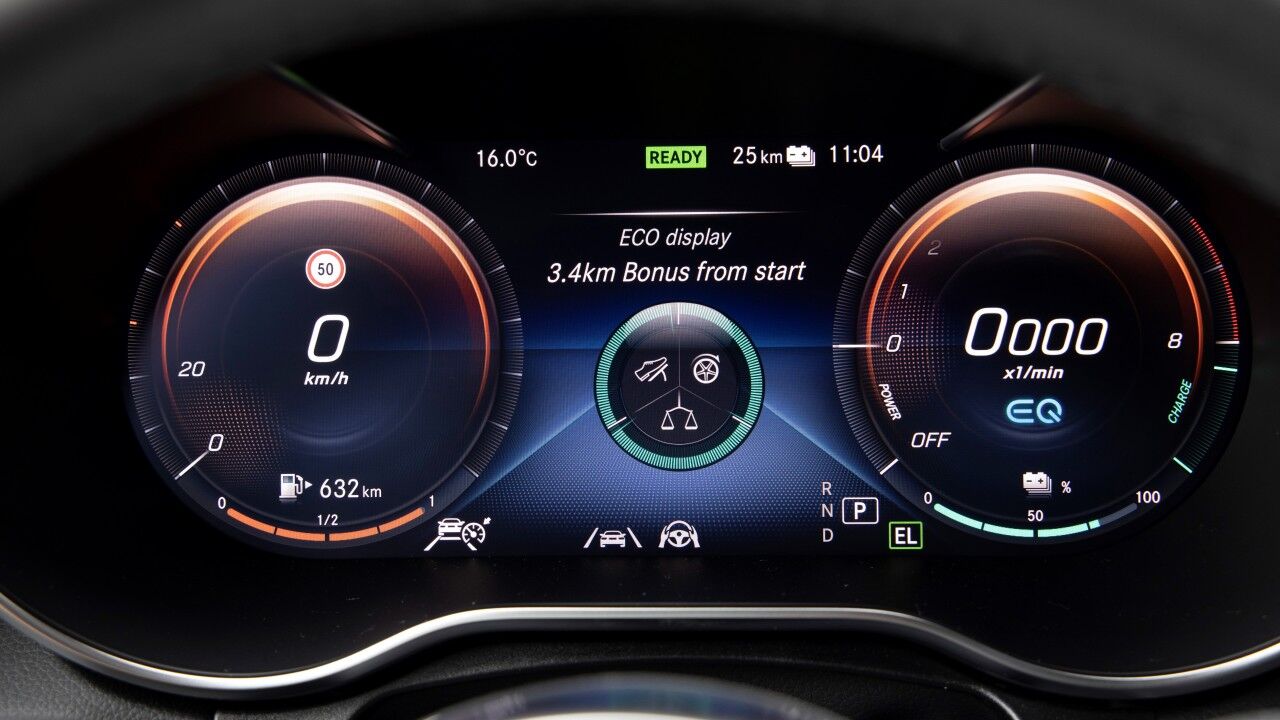El habitáculo es prácticamente idéntico a cualquier otro modelo de la gama GLC, salvo por algunos detalles muy específicos como las funciones del cuadro de instrumentos. El sistema de infoentretenimiento está programado con ubicaciones de puntos de carga. Incluso hay una función mediante los comandos de voz que permite, simplemente, pedirle al vehículo que te encuentre un punto cercano a través de los distintos servidores de Mercedes me Charge.