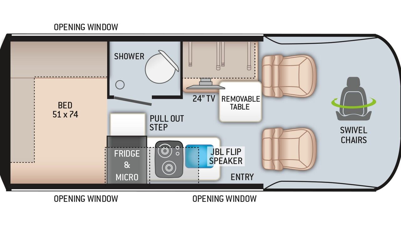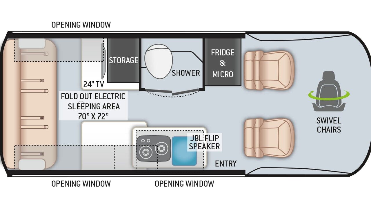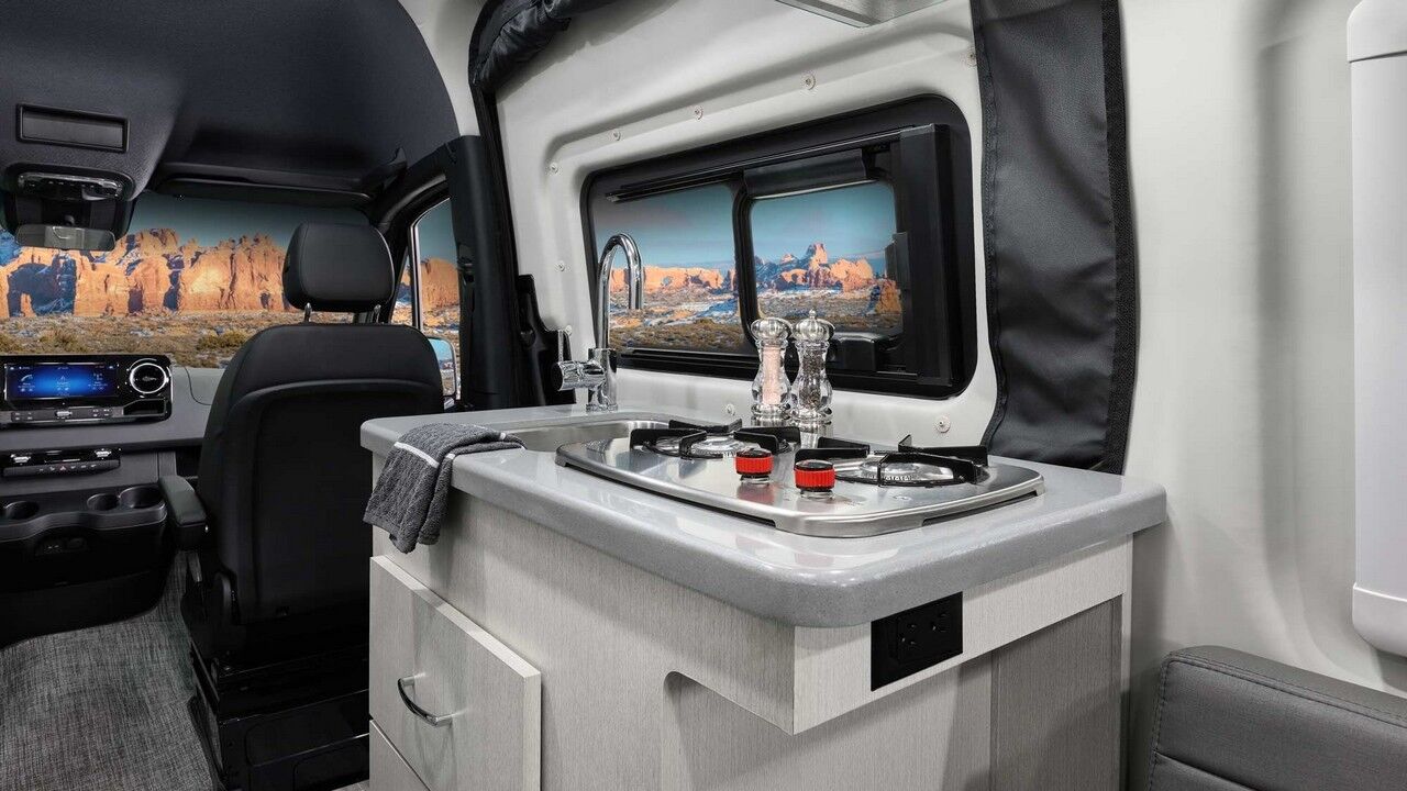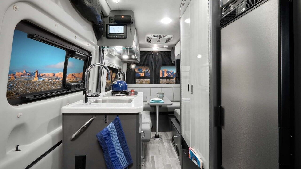 Dentro de este hábitat móvil, solo dos huéspedes tendrán un lugar para dormir y lo harán en un sofá cama plegable que se encuentra en la zaga. En el lado de babor de la caravana, se encuentra un centro de entretenimiento, de almacenamiento y el baño. Aquí está el inodoro, una ducha con cortina y un sistema de ventilación eléctrica. Además, a babor está el frigorífico de la cocina vis-a-vis. Mencionando a la cocina en sí, a estribor dispone de todo lo que una pareja necesitaría para mantenerse fuerte: dos fuegos (de gas), un horno-microondas y un fregadero.