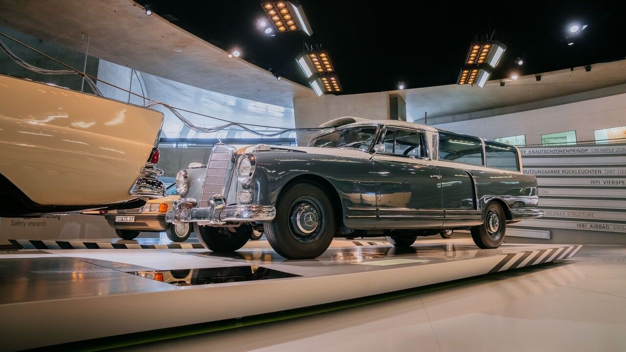Este peculiar Mercedes-Benz cogía prestada parte de la carrocería del equivalente al Clase E de 1960 (W189), aunque sustancialmente modificada para contener una generosa dotación de equipamiento a bordo. Porque solo la mitad del coche parece un “Adenauer” estándar (como se conocía debido al primer canciller alemán Konrad Adenauer). La diferencia comienza detrás del pilar B: de ahí hacia atrás se extiende una parte trasera elegante y alargada generosamente acristalada con ventanillas panorámicas, que recuerdan a un modelo familiar.