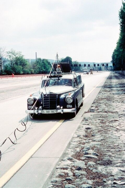 Después de todo, el coche de medición no solo tenía que seguir a otros vehículos sin esfuerzo, sino que también tenía que poder transportar el voluminoso equipo. Durante muchos años, el Mercedes-Benz 300 “Estate” reconvertido se empleó con éxito como laboratorio de medición rodante. Para este propósito, tenía que conectarse a otro coche a través de un cable de hasta 30 metros de largo, una especie de “red área local” (LAN) temprana. La línea transmitía datos de sensores a dispositivos de medición sensibles que se acomodaban en la zaga.
