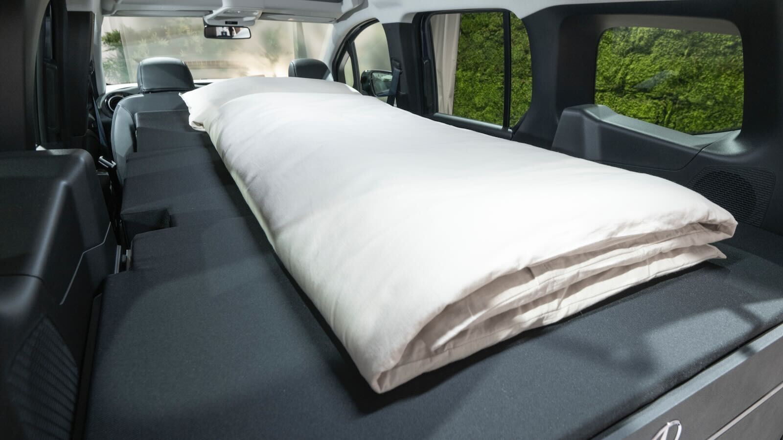 Y, por supuesto, incluye una cama, con un somier que se despliega sobre el módulo junto con un colchón de 10 cm de espesor, que da como resultado una cama de 2 metrios de largo por 1,15 de ancho. La cama puede plegarse sobre los asientos traseros, no han de quedar condenados en un viaje. Si se incluye el techo desplegable, puede estarse de pie en la parte trasera... y tener una cama extra arriba (de 1,97 x 0,97 metros). Las ventanillas traseras tienen un seistema que se oscurece con sólo pulsar un botón.
