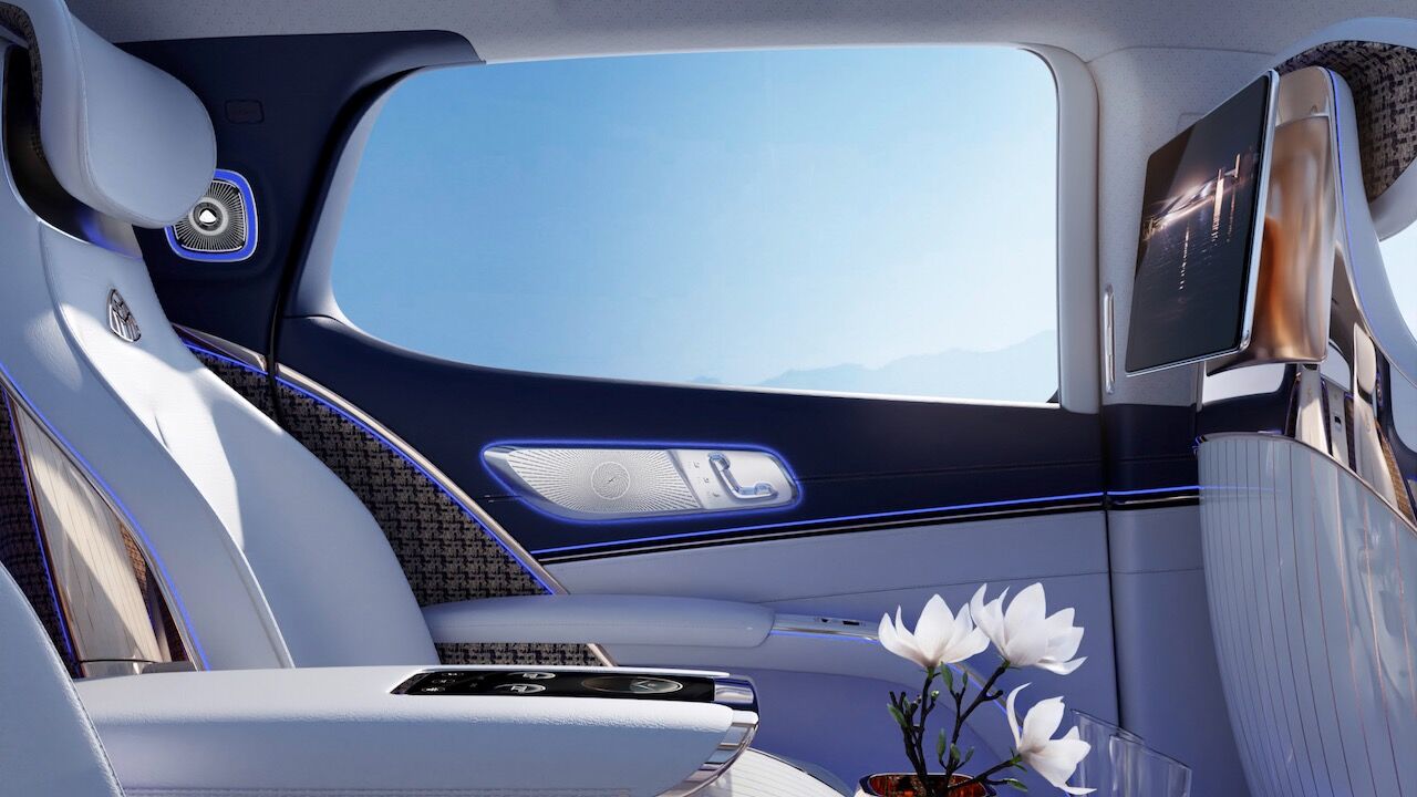 Este Mercedes-Maybach EQS Concept tiene una configuración de cuatro asientos individuales, con los dos traseros «First-Class» para viajar con total comodidad. En esta segunda fila también hay una consola central suspendida desde la que se pueden controlar todo tipo de funciones, además de sendas pantallas en los reposacabezas delanteros. Incluso hay detalles como el inserto de serie para jarrones que permite decorar con flores el habitáculo del SUV.