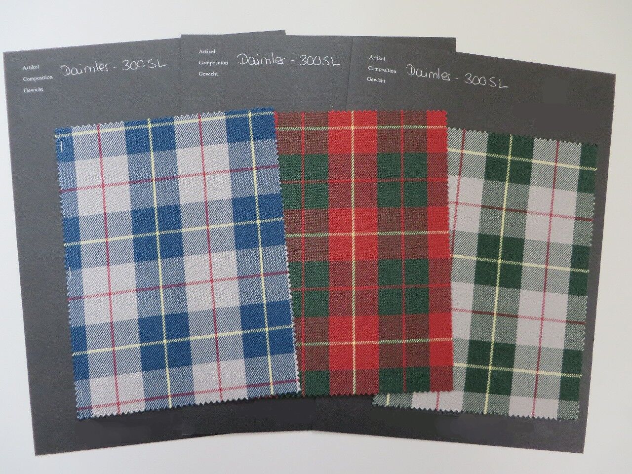 El Mercedes-Benz 300 SL W198 se fabricó entre los años 1954 y 1958, heredando muchos de los elementos que tenía el W194 de competición. Uno de ellos era la tapicería interior en tela, con motivo de cuadros y combinando varios colores. Había tres combinaciones, la L1 (azul y gris), la L2 (rojo y verde) y la L3 (verde y beige). La primera fue la preferida de la época y alrededor del 80 % de unidades salieron con esta composición.
