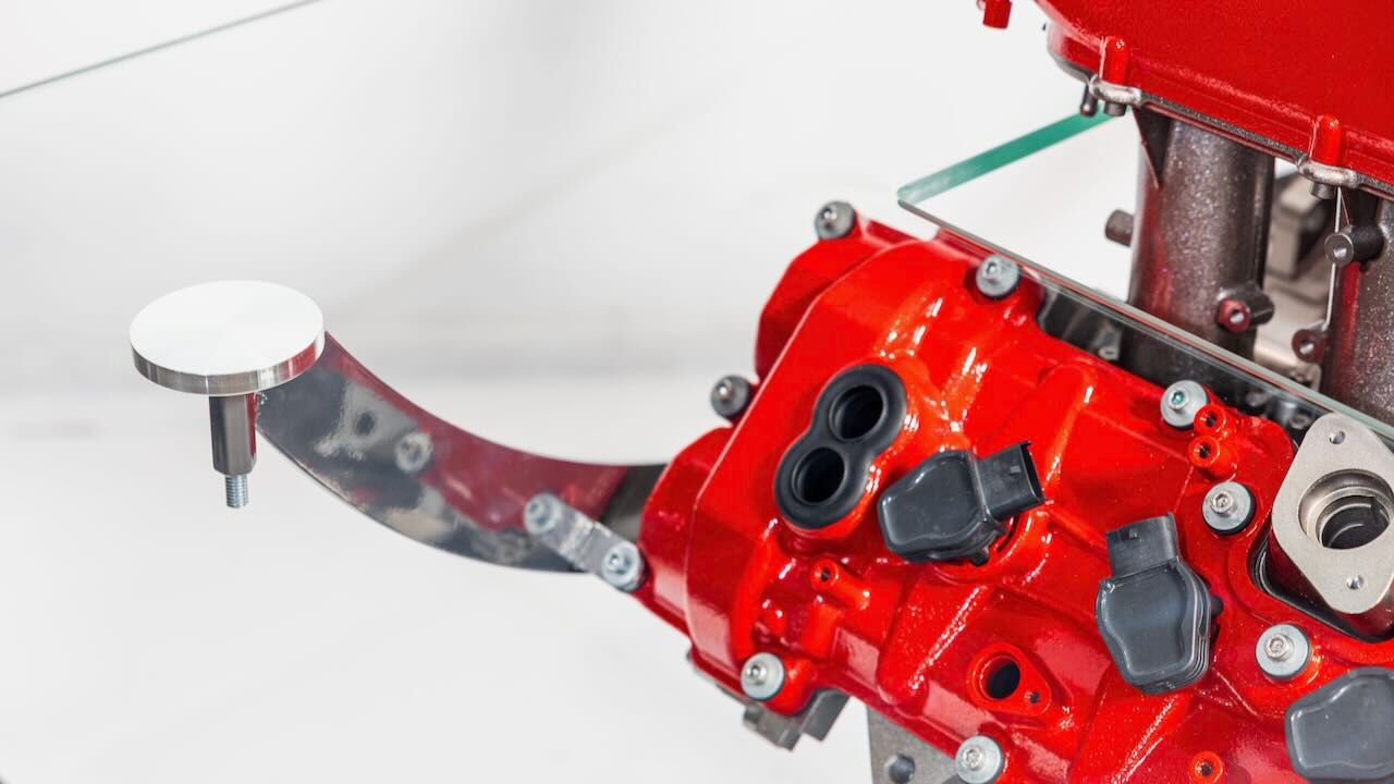 La mesita está construido a partir de un auténtico bloque de ocho cilindros en V de un Ferrari 458 Italia (código interno F136). Eso sí, llamarla «mesita» es quizá algo inexacto cuando sabes que oesa cerca de 113 kg, lo que justifica la presencia de discretas ruedas para desplazarlo con comodidad por cualquier espacio.