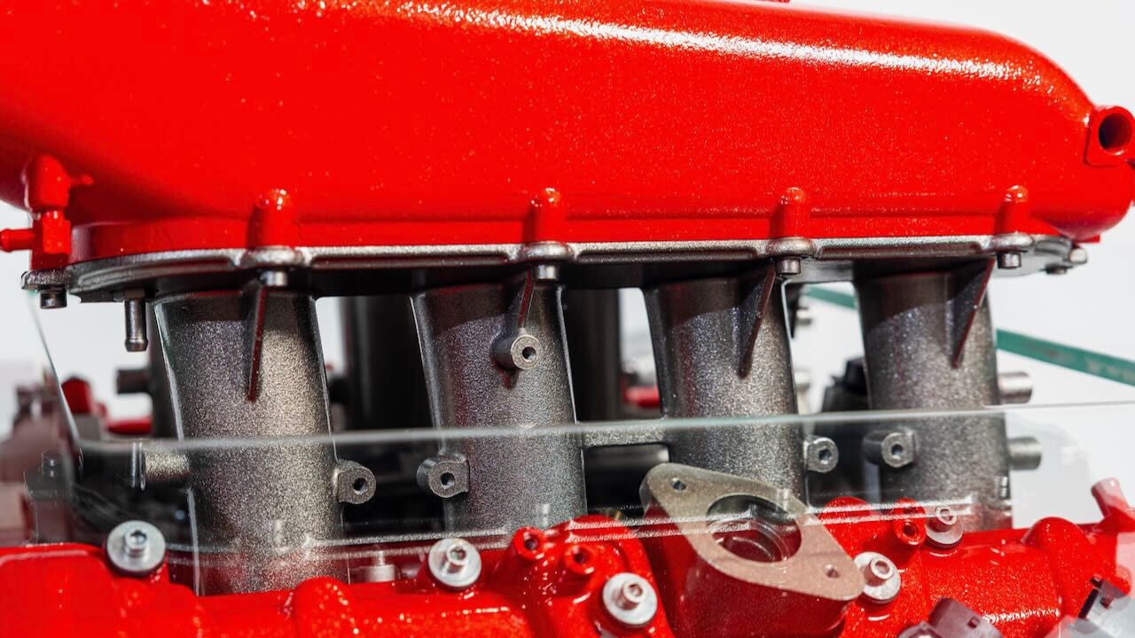 El detalle visual más selecto es el recorte central del cristal, que permite que los icónicos plénums de admisión rojos —coronados por los logotipos Ferrari— sobresalgan literalmente por encima de la superficie, manifestando orgullo mecánico y elegancia técnica. Todo el soporte ha sido realizado en metal, asegurando la máxima estabilidad y permitiendo disfrutar de la ingeniería sin renunciar al diseño.