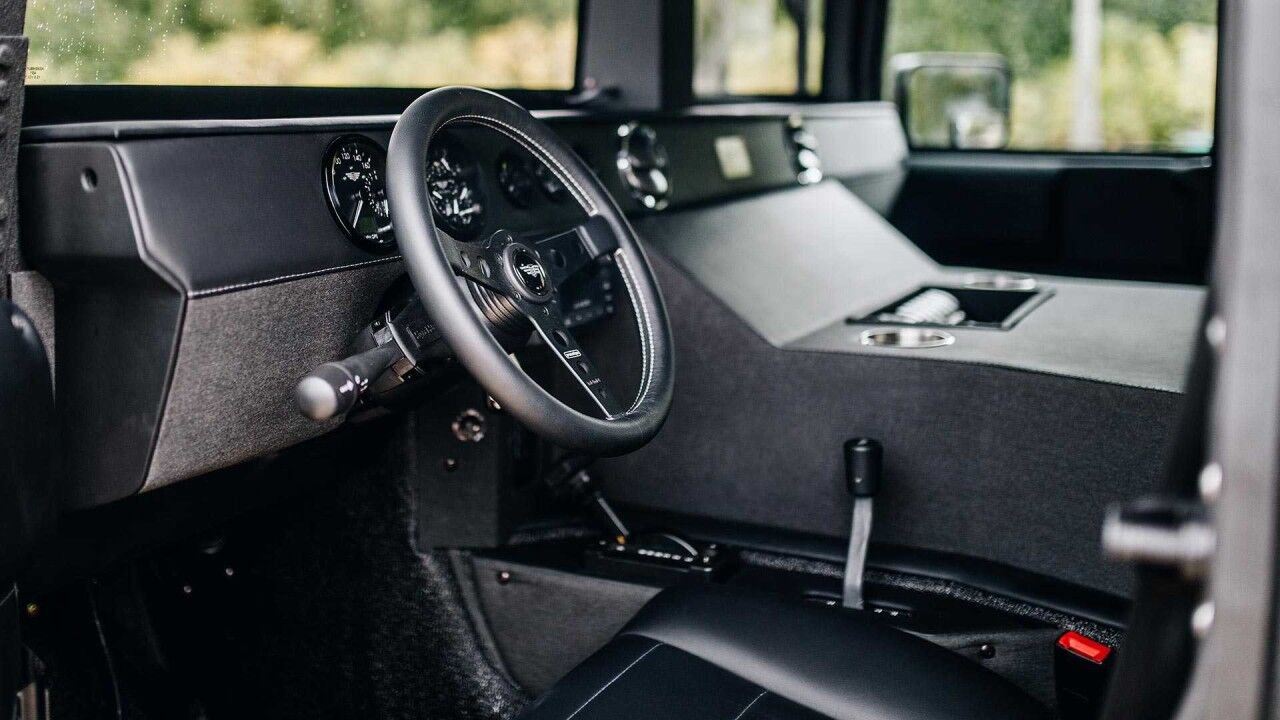Un juego de frenos Wilwood con rotores ranurados y perforados de 26 centímetros son realmente necesarios para desacelerar esta enorme mole. Los parachoques cuentan con barras de protección y, en el caso del delantero, con un cabestrante capaz de arrastrar casi cinco toneladas y media. Al igual que su predecesor, la unidad #002, el exterior del nuevo Mil-Spec Hummer H1 está acabado en un tono Deep Sky Black impregnado con Kevlar “para ayudar a repeler los rasguños del carrito y de la compra”.