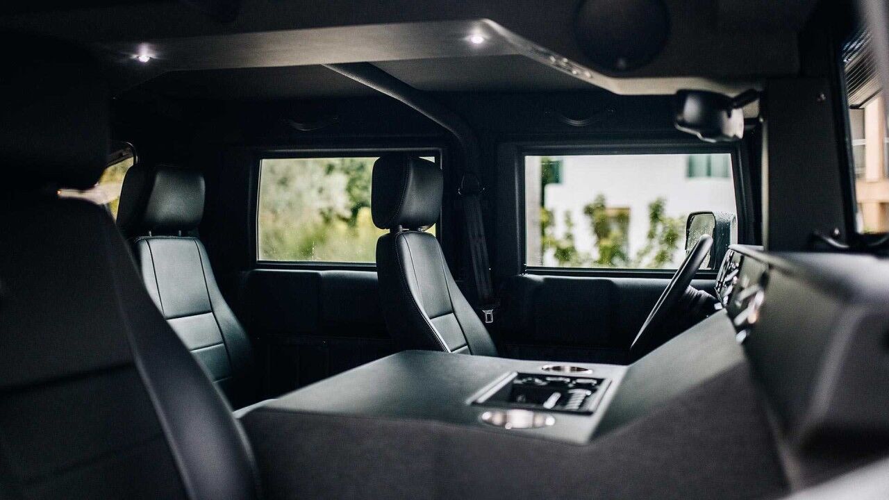 En el interior, la sexta entrega de Mil-Spec continua los pasos del exterior: apostar todo al negro. El suelo se ha cubierto de vinilo fácilmente limpiable con un manguerazo, un techo acolchado que mejora la insonorización y, por su puesto, cada plaza cuenta con su propio equipo de aire acondicionado. También cuenta con numerosos puertos USB y tomas de 12 V, un sistema de ifoentretenmiento, un equipo de sonido JL Audio de nueve altavoces con 700 W de potencia y una caja fuerte en el maletero.