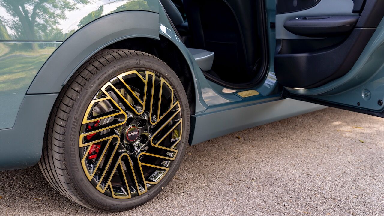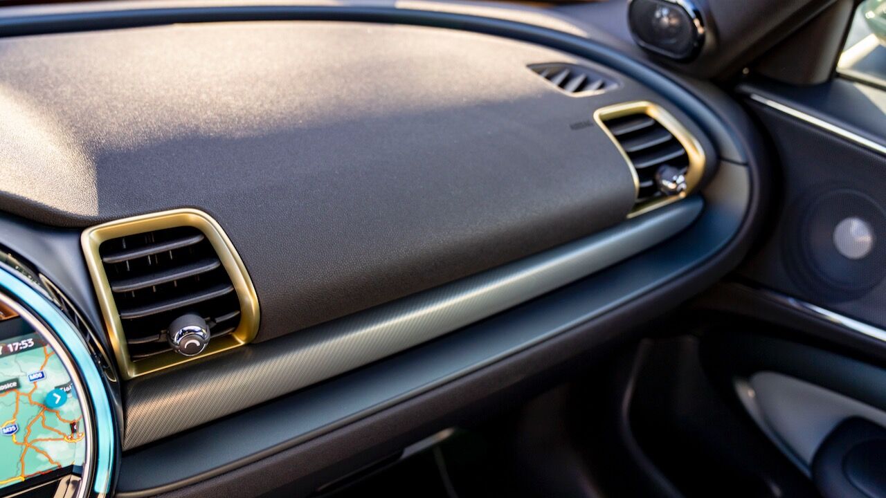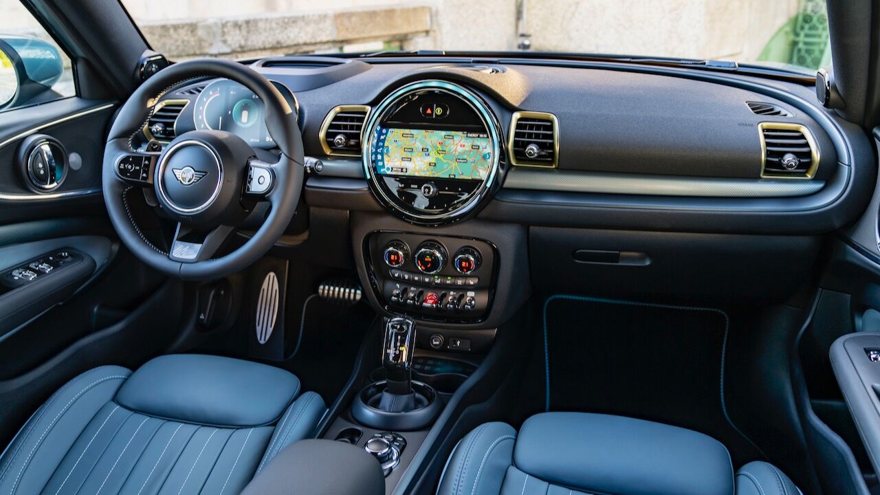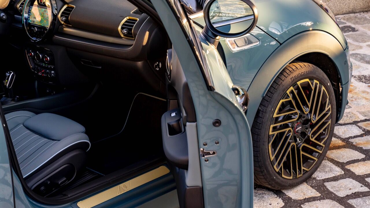 Hay detalles que hacer contraste al ir en negro brillante, como es el caso del techo, los retrovisores, las manillas de las puertas e incluso las llantas específicas de 18 pulgadas, que llevan también el tono Refined Brass para hacer destacar. Hay toques en esa especie de dorado en el marco de la parrilla y la inscripción Clubman de la zaga. También en el interior, donde se perciben unos asientos deportivos en cuero MINI Yours Lounge Sage Green, que también se pueden escoger en la tapicería Lounge Carbon Black.