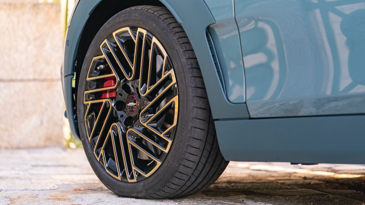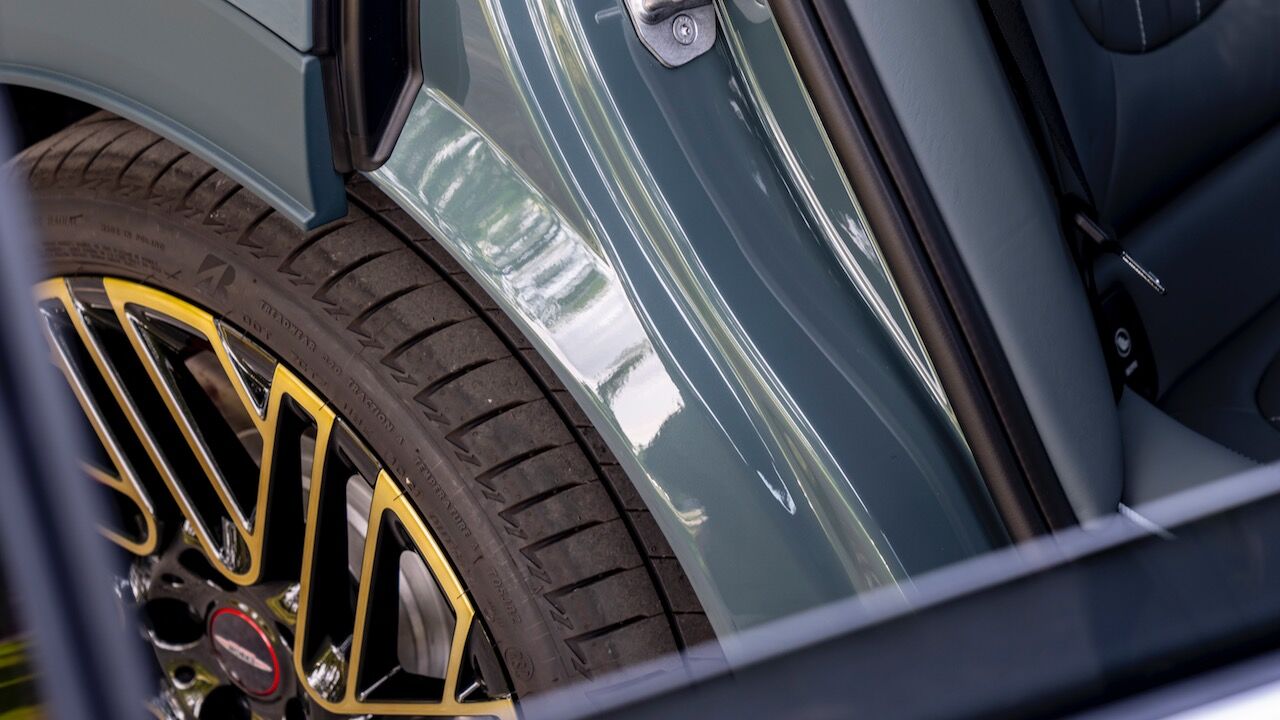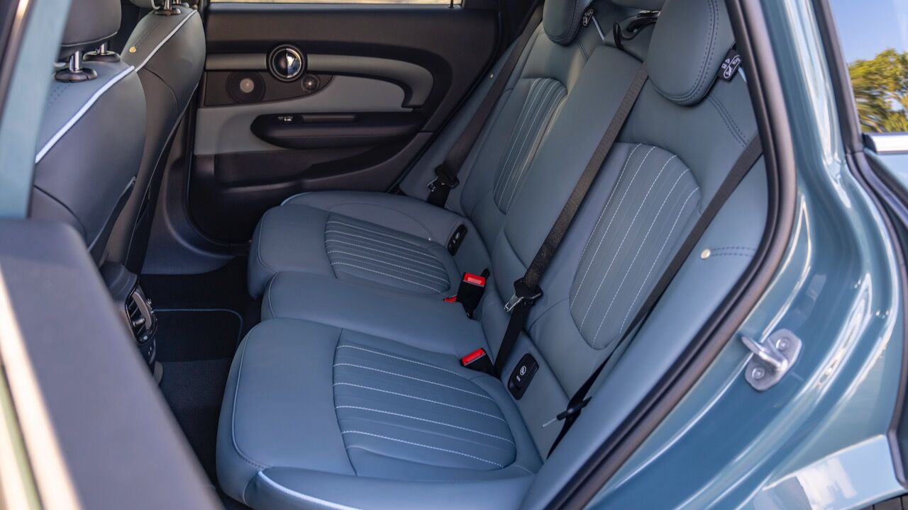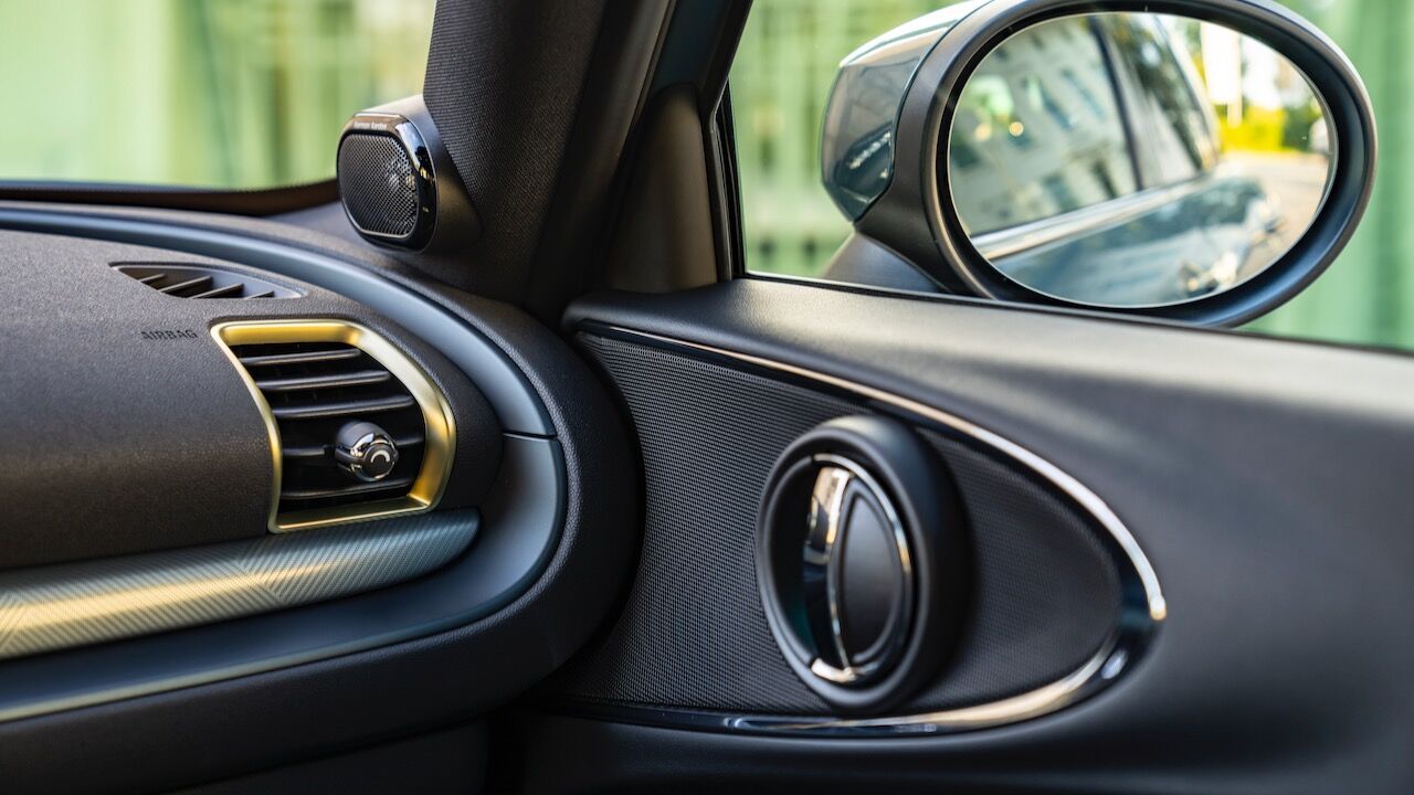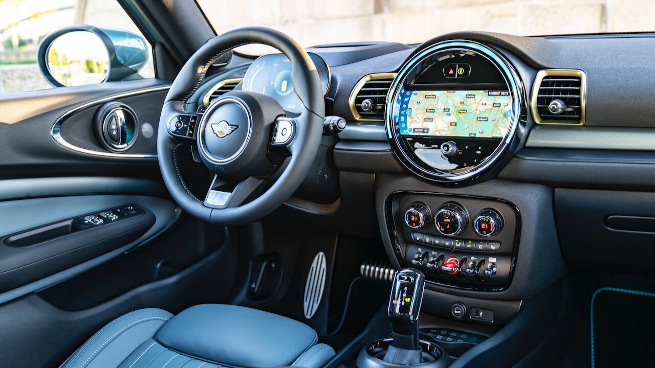 Hay detalles que hacer contraste al ir en negro brillante, como es el caso del techo, los retrovisores, las manillas de las puertas e incluso las llantas específicas de 18 pulgadas, que llevan también el tono Refined Brass para hacer destacar. Hay toques en esa especie de dorado en el marco de la parrilla y la inscripción Clubman de la zaga. También en el interior, donde se perciben unos asientos deportivos en cuero MINI Yours Lounge Sage Green, que también se pueden escoger en la tapicería Lounge Carbon Black.