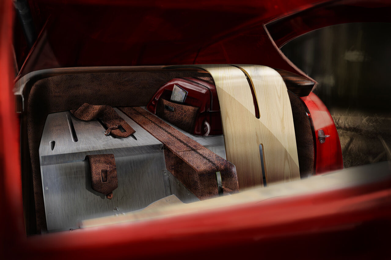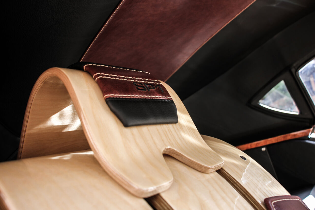 En el interior, se onservan zonas de curvas en las bases de los asientos, pulidos para mostrar las vetas de la madera. Como acolchado se usa un cuero rojo que eligió personalmente el cliente, con detalles en negro, como las costuras. El sistema de información y entretenimiento del automóvil es un iPad, instalado en la consola central con unas correas de cuero.