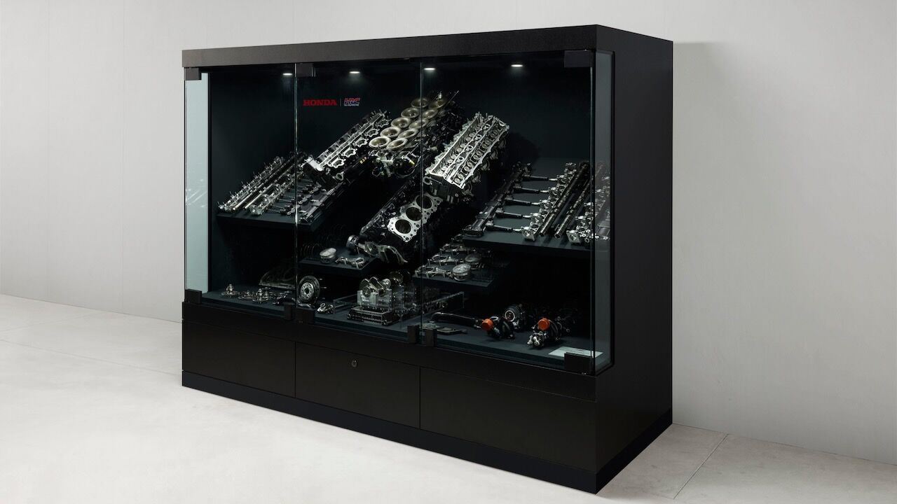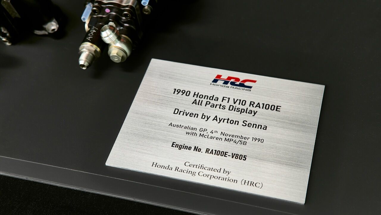 Su conservación es excepcional: desmontado con precisión por los técnicos de Honda y presentado en una vitrina de exposición personalizada, acompañado por un certificado oficial de autenticidad de Honda Racing Corporation. El motor V10 RA100E representa el cenit de la primera etapa de Honda como proveedor dominante en la Fórmula 1, periodo en el que logró cinco títulos de constructores consecutivos y catapultó a pilotos como Nelson Piquet, Alain Prost y, sobre todo, Ayrton Senna, al Olimpo de los campeones.