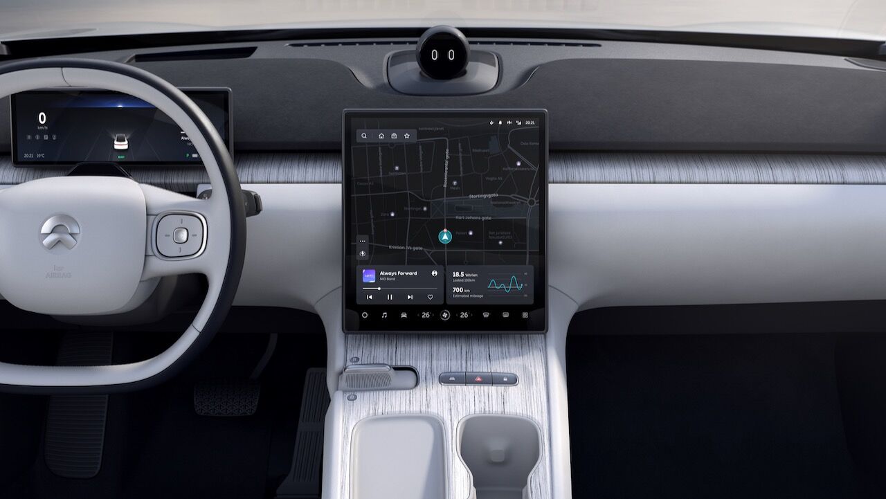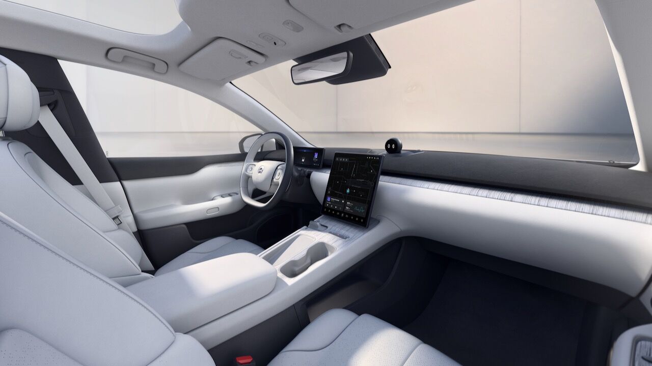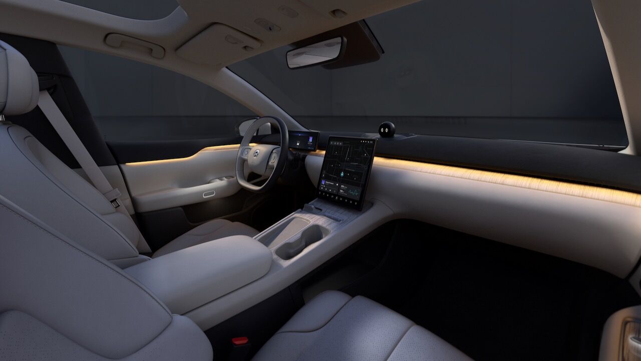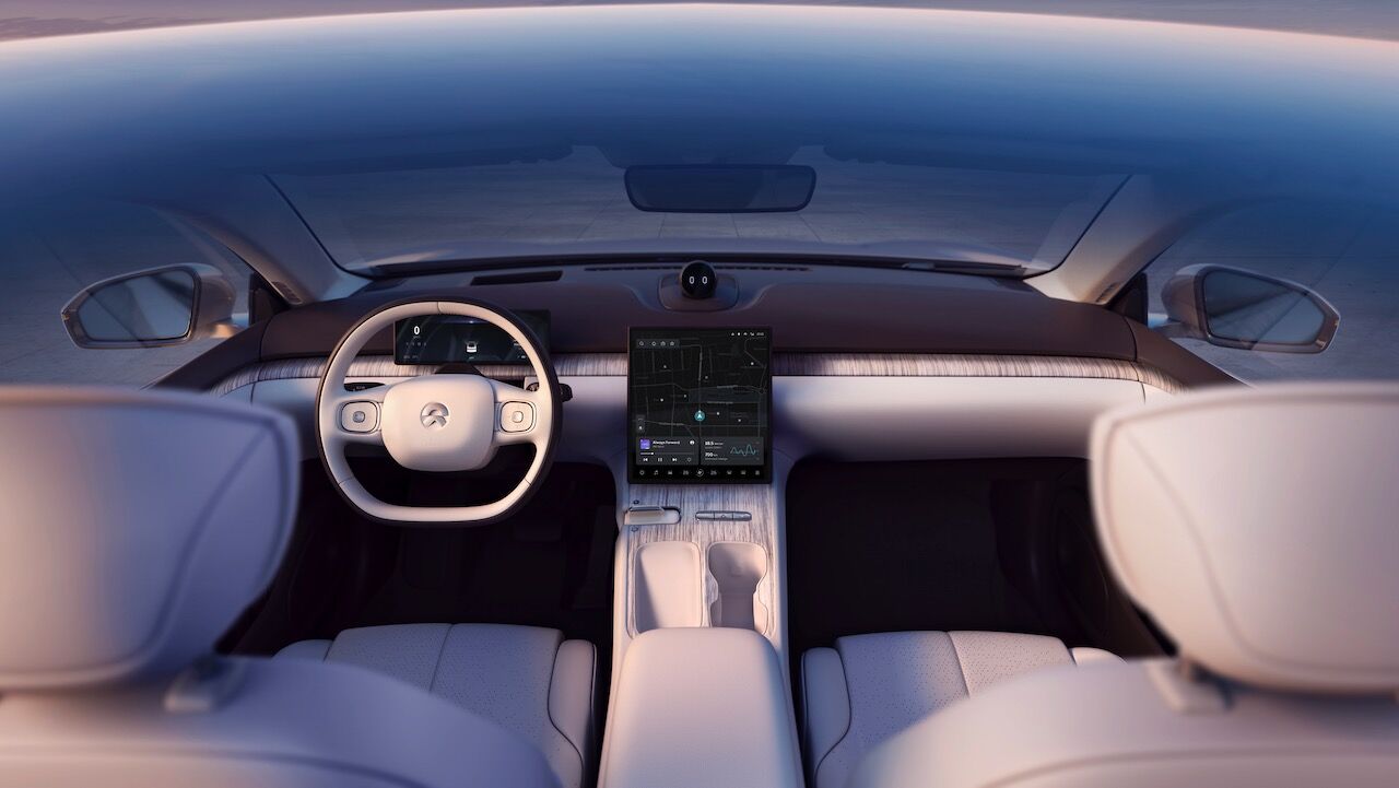 El interior del NIO ET7 no se queda atrás. Va sobrado de tecnología gracias al sistema Qualcomm Snapdragon de tercera generación, que se controla a través de la pantalla AMOLED de 12,8 pulgadas que ocupa la parte central del salpicadero. También se beneficia de un sistema de inteligencia artificial llamado «Nomi», además de un sistema de sonido envolvente con 1.000 W y 23 altavoces de serie. Otras característica es la calidad que se consigue con materiales sostenibles como el ratán Karuun que está presente en la tapicería. Los asientos vienen con calefacción y ventilación de fábrica.