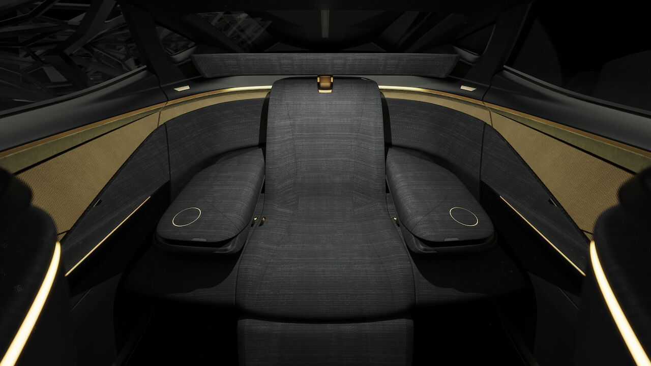 Llama la atención su configuración en formato 2+1+2. Esta idea ha sido concebida como «premier seat» y deja esa plaza central con unas dimensiones más generosas y una posición privilegiada. Se consigue plegando parcialmente los otros dos asientos. En este prototipo se ha cuidado mucho la calidad de los materiales y se crea contraste con los tonos dorados por encima de la tapicería negra.
