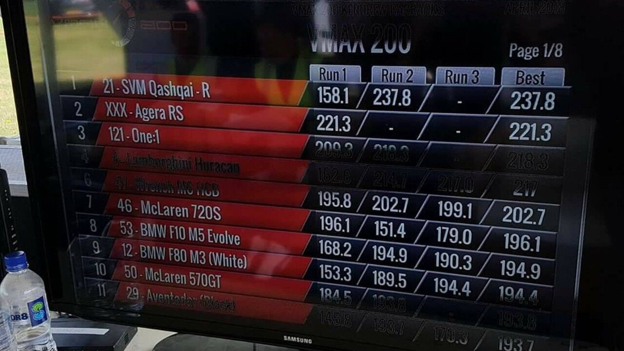 Como nota curiosa, este Qashqai llegó a superar a todo un coche de récord como es el Koenigsegg Agera RS, que se tuvo que confirmar con 356 km/h en dicho evento (a pesar de que sea capaz de mucho más). De esta forma el vehículo preparado por Severn Valley Motorsport se convierte en el SUV más rápido del mundo, superando a un Toyota Land Cruiser que alcanzó los 370 km/h con una potencia similar.