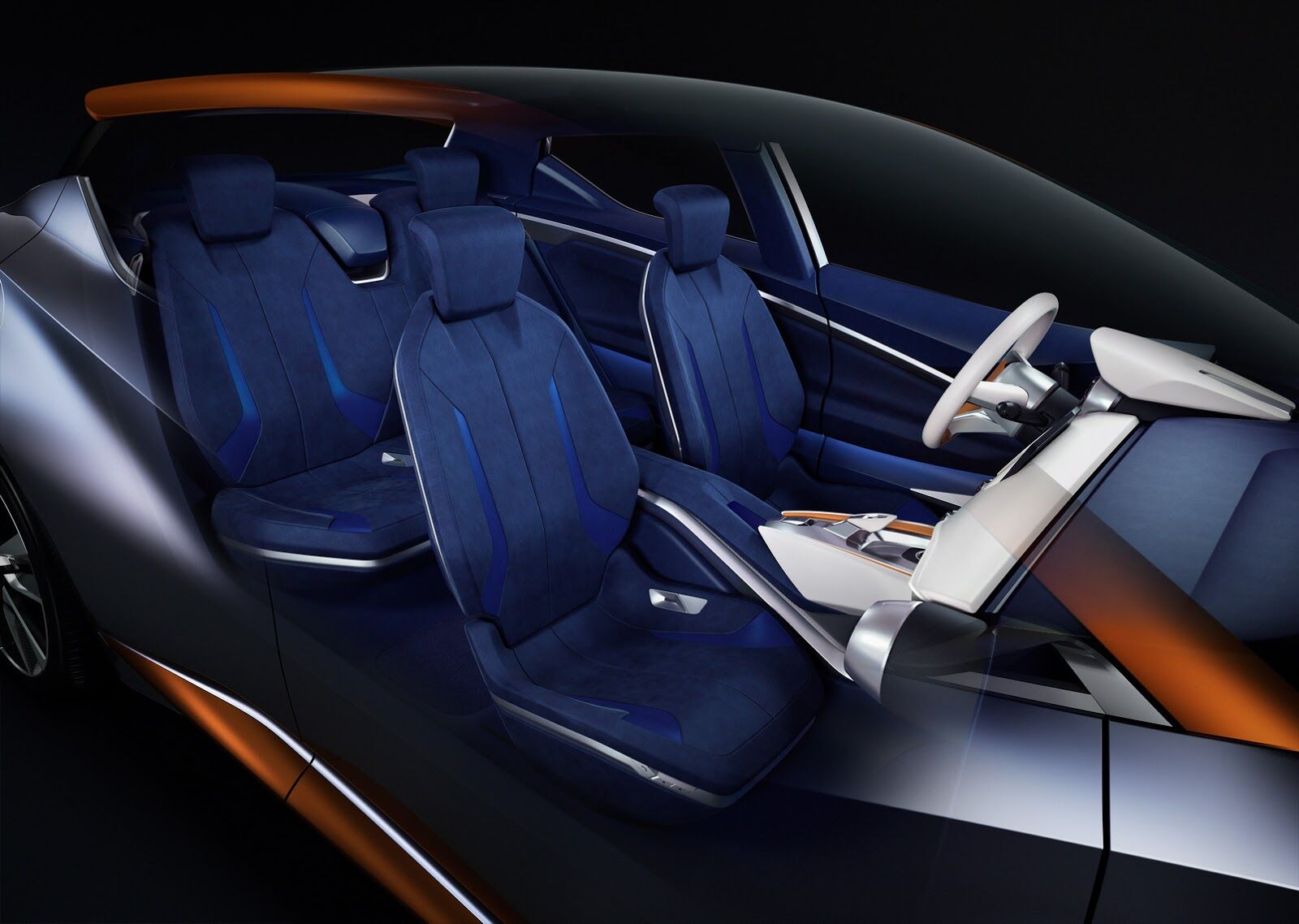 El interior, al que se accede mediante unas puertas de apertura suicida, como en el Opel Meriva, por ejemplo, es todavía más futurista y muy difícil (por no decir imposible) que llegue así a producción. Podemos observar que consta de cuatro asientos individuales y un puesto de mando muy enfocado al conductor, con un volante bastante retro, lo que nos ha recordado bastante a los Nissan IDx. En la consola domina una tablet en forma de ala, en la que se muestra información del coche, del navegador o la música.