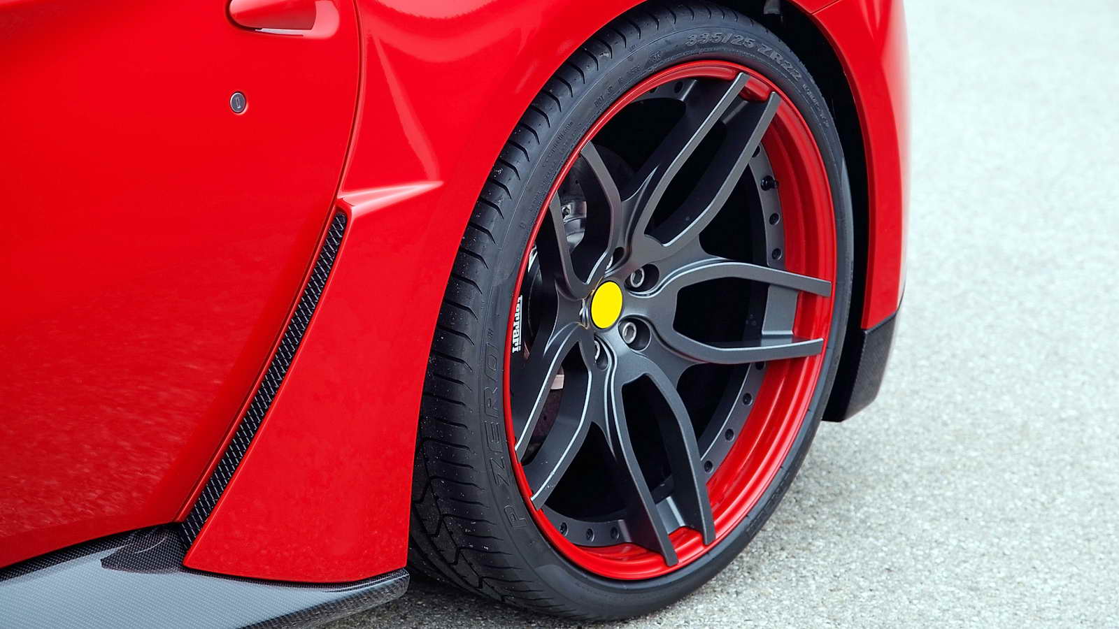 A la hora de rematar el conjunto en el eje delantero se montan unas preciosas llantas forjadas, de tres piezas, modelo Novitec Rosso NF5 NL de 21 pulgadas de diámetro y 9,5 pulgadas de garganta, que se combinan con las de 22 pulgadas de diámetro y 12 pulgadas de garganta del eje trasero. En ambos casos se recurre a unos pegajosos neumáticos Pirelli P-Zero en medidas 255/30 ZR 21 en el tren anterior y 335/25 ZR 22 en el posterior. Gracias a ello la carrocería presenta aún una más evidente forma de cuña.