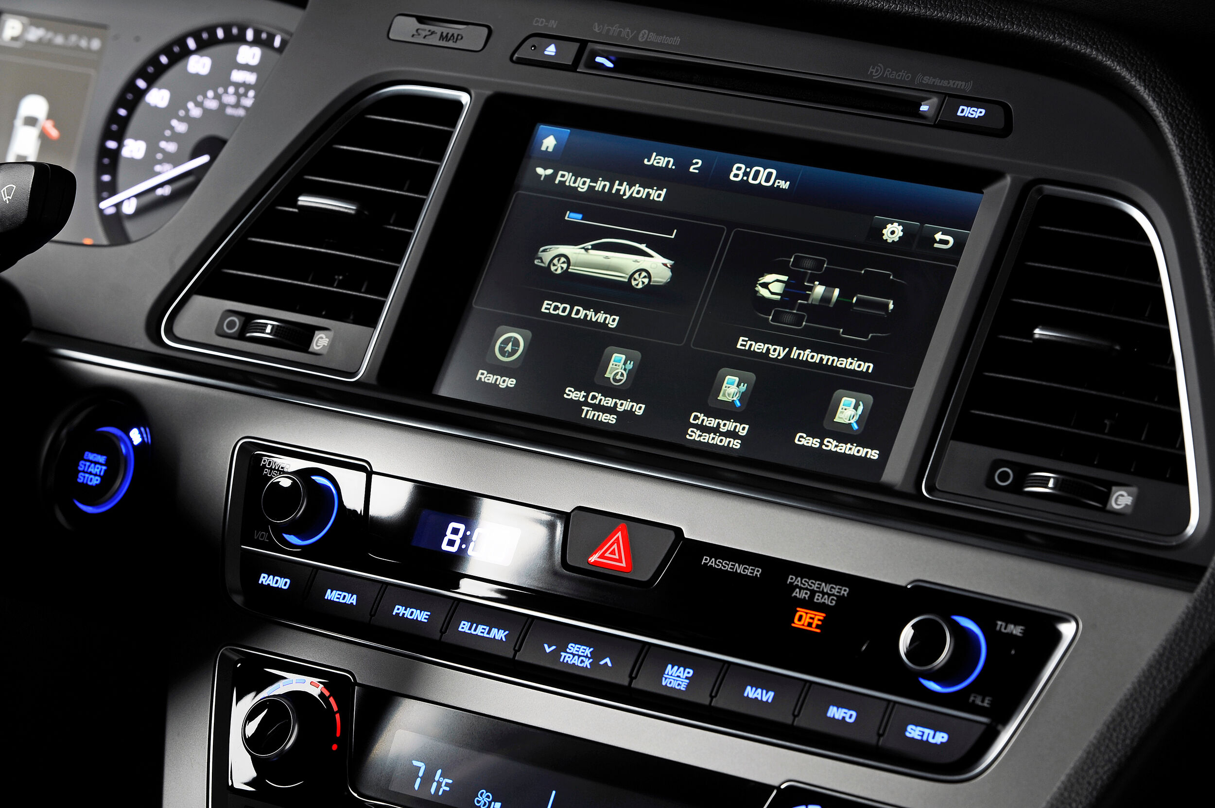 En el interior, un cuadro de instrumentos específico proporciona datos adicionales acerca de las funciones del sistema PHEV. Hay un indicador de carga en la parte superior del salpicadero, para que resulte sencillo ver el estado de la carga desde el exterior del vehículo. Los propietarios pueden manejar y controlar el coche en remoto con la aplicación Blue Link para smartphone. Con ella se accede en tiempo real a los datos del Sonata PHEV y se pueden enviar órdenes específicas como poner el marcha el motor o cerrar las puertas. También gestionar los horarios de carga del vehículo, para aprovechar los horarios con tarifas más bajas.