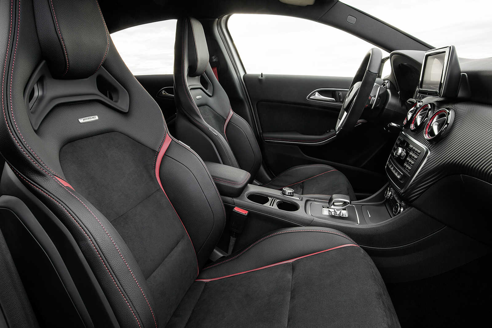 El interior está enfocado totalmente hacia el conductor, con una estética muy racing. Los asientos, que integran el reposacabezas, van tapizados de cuero y alcántara. El volante también emplea estos materiales nobles además de incluir unas levas de metal de mayor tamaño que en el resto de la gama. La consola central, fabricada en fibra de carbono, aloja por primera vez en un automático de la Clase A la selectora de cambios, en vez de encontrarse colocada junto al volante como viene siendo habitual en el modelo.