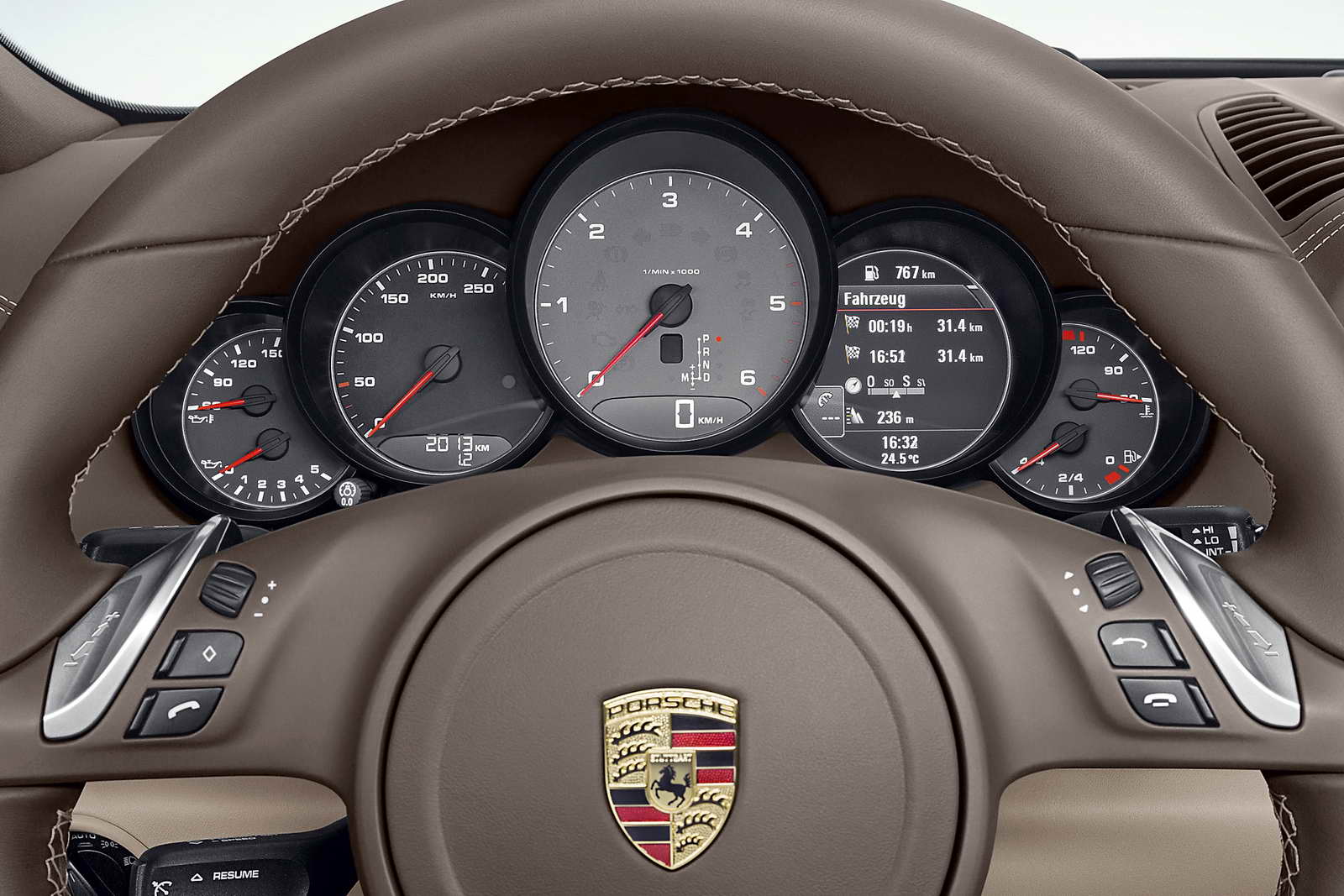 En cuanto accedemos al interior no cabe ninguna duda de que nos encontramos en un modelo de la firma de Stuttgart, tanto por el diseño eminentemente deportivo como por la calidad percibida, con materiales como maderas de gran elegancia, pasando por el aluminio o incluso el carbono todos ellos con ajustes primorosos. Justo tras el volante destacan los habituales cinco instrumentos redondos, típicos de la marca, que incluye la pantalla TFT a color de 4,8 pulgadas que muestra información del ordenador de a bordo o del sistema de navegación. En la parte central del salpicadero destaca especialmente el Porsche Communication Management (PCM) con pantalla táctil a color de 7 pulgadas y alta resolución que incluye el sistema de navegación y que puede equipar opcionalmente servicios online o de radio digital. La consola central descendente agrupa una gran cantidad de mandos, perfectamente dispuestos, pero que en algún momento pueden tornarse excesivos.