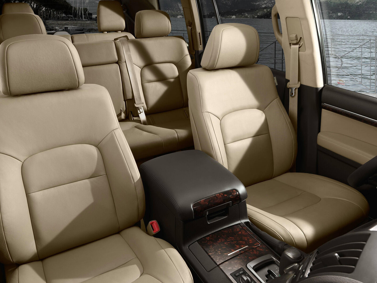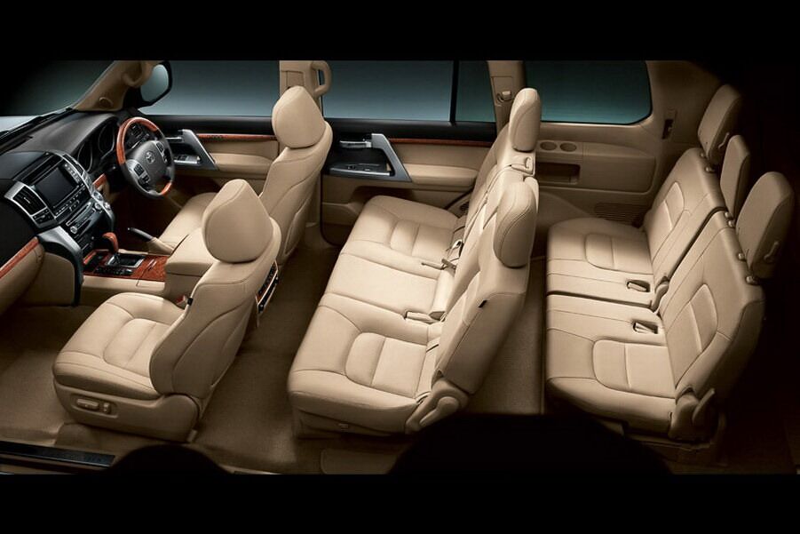 El interior ha mejorado la sensación de calidad con nuevos tonos y colores, así como nuevas maderas más lujosas. Se ha cambiado mucho la disposición que tenía eel salpicadero, sobre todo en la zona del equipo de audio, donde los adornos y las salidas de ventilación. El cuadro de relojes es nuevo, con nueva iluminación y una pantalla de información de color. Los asientos calefactables tienen ahora también ventilación, así como reposacabezas activos en caso de colisión. El Land Cruiser 200 tiene 7 plazas, distribuidas en 2-3-2: la segunda fila de asientos tiene una regulación longitudinal de 105 milímetros. El respaldo del asiento central incorpora un apoyabrazos. Cuando los asientos de la tercera fila no se utilizan, pueden plegarse contra el lateral del maletero. El sistema de plegado es muy resulta sencillo y no requiere demasiado esfuerzo para plegarlo. Para acceder fácilmente a la tercera fila de asientos, hay un dispositivo previsto en el asiento lateral derecho de la segunda fila. Con solo tirar de la palanca del asiento, el soporte del respaldo se pliega hacia delante, éste libera el cierre, abatiendo así el conjunto contra el asiento delantero.