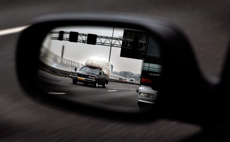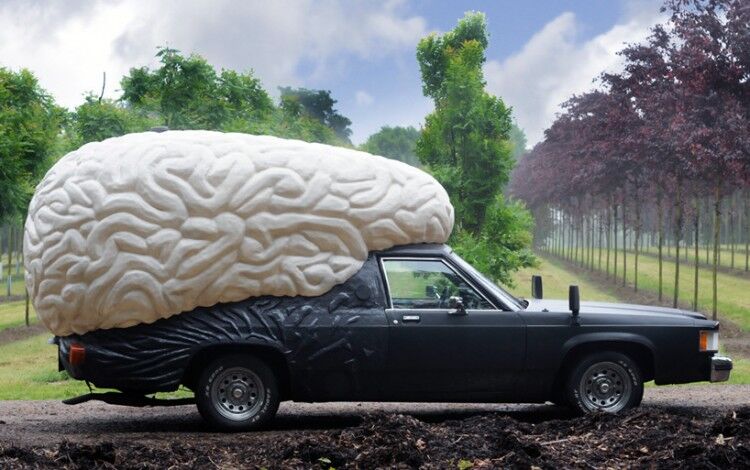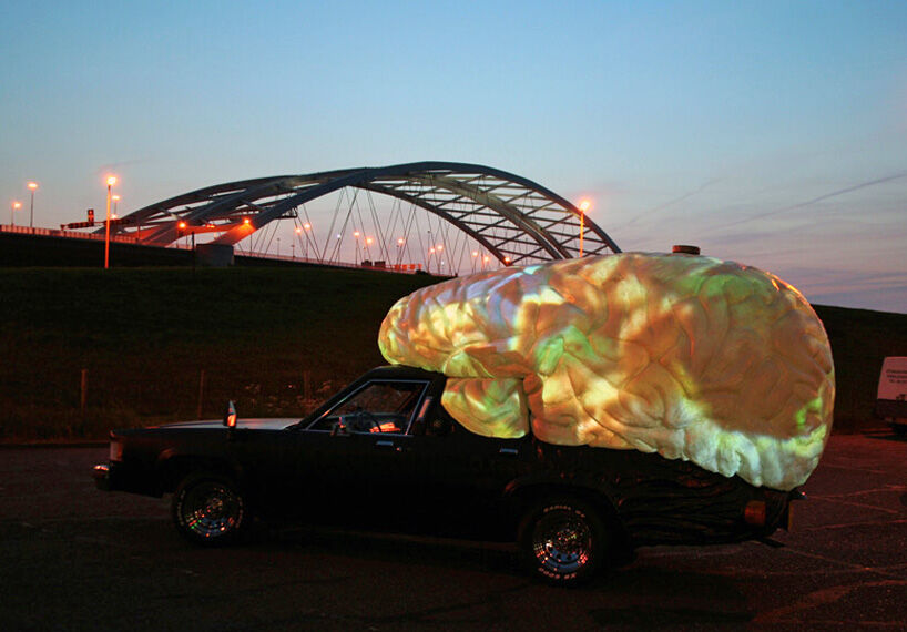 Su última creación, el Braincar, es un coche cuyo capó se transforma en un cráneo gigante. Durante el día conduce el coche por un barrio, ciudad o calle. Por la noche, el artista sueña con el coche a través de emisiones de video que se proyectan en la superficie del cerebro, de color blanco mate. Aquí puedes ver esas proyecciones en vídeo: