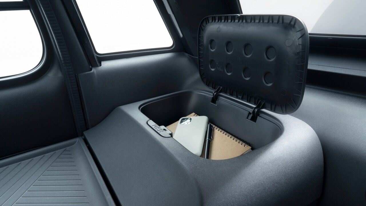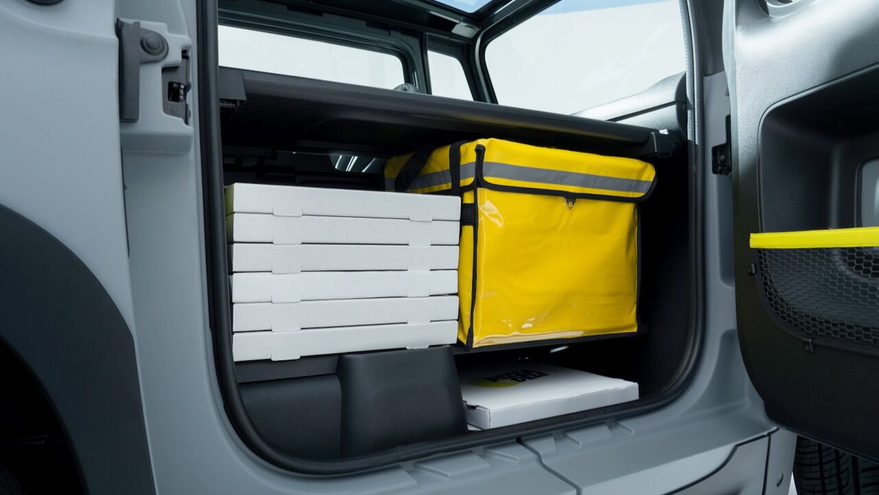 La clave ha sido eliminar el asiento del acompañante para crear un compartimento de carga modular que va separado del puesto del conductor por un panel vertical. La mercancía se puede introducir desde cualquiera de las dos puertas gracias a una cubierta que se abre hacia arriba y que aguanta hasta 40 kg. Sobre ella se puede poner un portátil o una tablet, incluso podría ser utilizada como escritorio. Detrás hay un compartimento para guardar objetos pequeños y bajo la cubierta es donde se encuentra el hueco más grande.