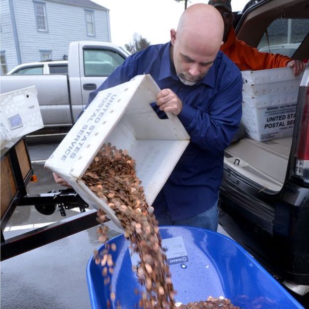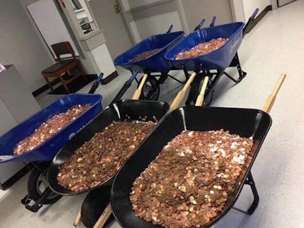 «Llegué a DMV a las 9:00 AM esta mañana. Después de hacer algunas entrevistas con estaciones locales en el aparcamiento, empecé a llevar los peniques dentro de DMV usando CINCO carretillas llenas de peniques sueltos (un total de 2.987’45$). Tras finalizar el papeleo para ser el titular de mi vehículo y pagar mis impuestos, en DMV empezaron a contar los peniques.